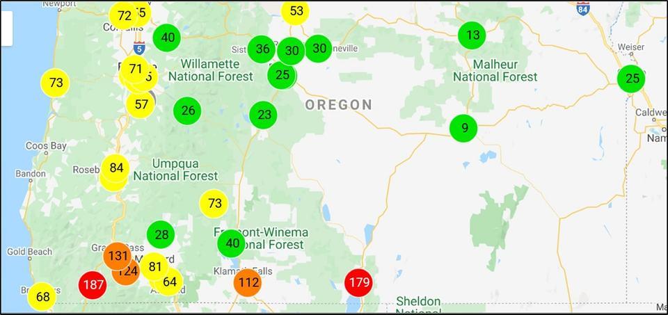 Current air quality around the state. We are probably going to be dealing with the Wildfire smoke from California for the next couple of days. We also can expect warm and dry conditions to persist for at least the next 7 to 10 days.