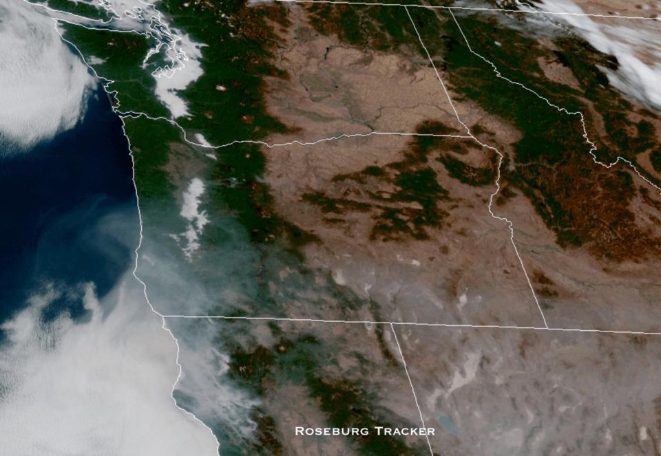 Light winds will keep California wildfire smoke in the Douglas County area a few more days. It won't be until Friday that we could see some relief. Sunny weather and above-average temperatures are in-store through Friday when colder, wetter weather arrives starting Saturday. Highs in the low 80's for the next few days, and then high 70's by Friday. Snow levels will drop down to 5,700 feet this weekend and snow flurries could be seen at Crater Lake and Mt Ashland. For further reading of the latest detailed forecast from the Medford NWS https://www.wrh.noaa.gov/total_forecast/getprod.php?new&prod=XXXAFDMFR&wfo=mfr Photo is the most recent satellite image of Oregon from the GOES west satellite.