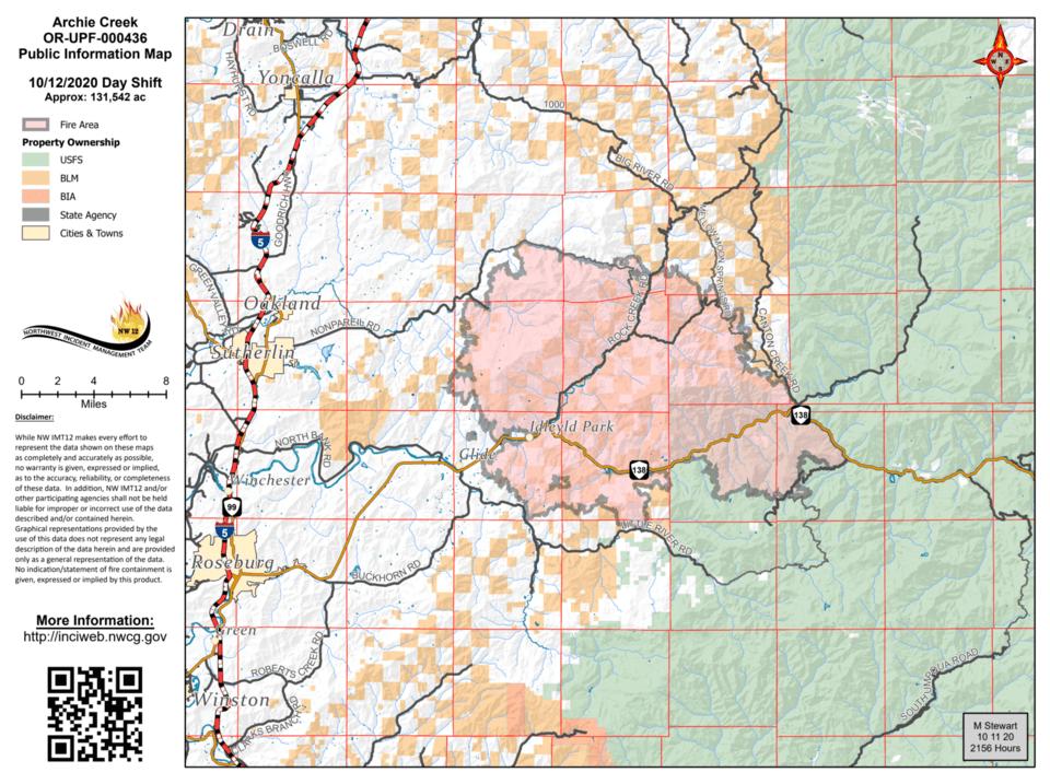 As of Monday, October 12, the Archie Creek Fire is now 95% contained. The Mt Thielsen Fire is now 75% contained. Archie Creek – Mop-up and patrol continued across all divisions on the fire. Crews worked to identify equipment and supplies no longer needed on the fire and returned these supplies back to base camp for refurbishment and re-use. Firefighters continued suppression repair work to minimize erosion and to protect natural and cultural resources. Fire crews continued to remove hazard trees along transportation corridors. The BAER team continued their post-wildfire assessments to determine appropriate mitigation actions to restore damaged natural resources on National Forest lands. Thielsen – Fire crews continued mop-up and suppression repair work along containment lines. In the North Diamond Division, firefighters improved ingress and egress to Highway 138 and removed hazard trees along FS 005 road. Additionally, firefighters removed debris in the southern area and chipped vegetation debris in the northern area. Today’s Operations: Archie Creek – Firefighters will patrol around the fire and continue mop-up work identifying and extinguishing any remaining hot spots near the fire perimeter. The work to identify equipment and supplies no longer needed on the fire lines continues today. Fire crews will collect pumps, hoses, and litter from control lines, roads, and staging areas. Fire suppression repair work is ongoing to restore natural drainage along fire lines, minimize erosion, and protect natural and cultural resources. Firefighters will continue to methodically remove hazardous fire-weakened trees and snags near roads. The BAER team will be working to assess post-wildfire environmental conditions and determine appropriate actions to mitigate the effects of fire suppression on National Forest lands. Thielsen – Fire crews will remain engaged in mop-up and suppression repair work along containment lines. In the North Diamond Division, work on improving ingress and egress to Highway 138 will continue. Firefighters will identify and remove hazard trees along FS 005 road. Firefighters will continue debris removal in the southern area and chipping in the northern area. Safety Message & Help for Fire Victims: Please stay out of fire closure areas for your safety and that of the firefighters. Sawyers are felling hazard trees along roadway corridors, and there is increased traffic as firefighters reposition heavy equipment on narrow roads. Visit the Oregon Department of Environmental Quality at http://www.oregon.gov/deq for Air Quality information. Be cautious driving in low visibility and wet conditions. Disaster aid, and organizations helping victims of the Archie Creek Fire, can be found at https://inciweb.nwcg.gov/incident/article/7176/57029/. Closures, Restrictions & Evacuations: · Roads – Highway 138E is open, but delays should be expected. The route to Miller Lake via FS Road 9772 remains closed from the intersection with Hwy. 97 to the intersection with FS Road 110 due to firefighter traffic. Drivers are being directed to take FS Road 9774 to connect with FS Road 110 as an alternative route. See www.tripcheck.com for updates on highway closures. · Bureau of Land Management – All BLM-managed lands in the Swiftwater Resource Area east of the Range 3 and 4 boundary line and north of Little River Road are closed. This includes portions of Rock Creek Road and all BLM recreation and day use sites within the closure boundary, including Rock Creek, Lone Pine, Millpond, Scaredman and Susan Creek campgrounds. Cavitt Creek Falls Campground is closed for the season. For more information, see https://inciweb.nwcg.gov/incident/article/7176/57115/ · Umpqua National Forest – Sections of the North Umpqua and Diamond Lake Districts remain under a fire closure order. Umpqua Hot Springs, fire lookouts, cabins and group picnic sites remain closed. Diamond Lake Resort and Diamond Lake are now open for public recreation, but Diamond Lake Campground is closed for the rest of the year. North Umpqua District closure: https://inciweb.nwcg.gov/incident/article/7176/57090/ and Diamond Lake District closure: https://inciweb.nwcg.gov/incident/article/7195/57398/. More information on Forest Service closures is available at: https://www.fs.usda.gov/alerts/umpqua/alerts-notices. The Umpqua National Forest is currently at Industrial Fire Precaution Level I. The fire danger is Moderate. · Temporary Flight Restriction – No temporary flight restrictions are in effect for the Archie Creek or Thielsen Fires. · Evacuations – No evacuations remain in place. Incident website: https://inciweb.nwcg.gov/incident/article/7176/57867/