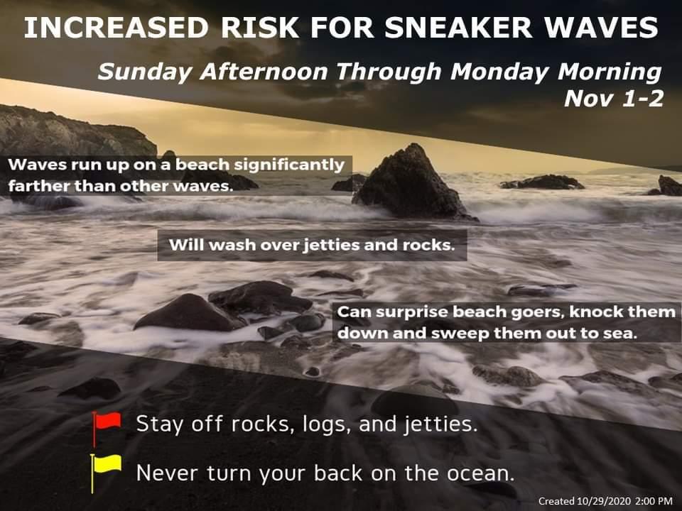 (NWS) Dangerous sneaker waves are possible Sunday into Monday morning along the Oregon coast from Reedsport to Brookings. Sneaker waves are waves that can surprise beachgoers, running up on beaches significantly farther than other waves or over outcroppings. Beachgoers can be knocked down and dragged into the very cold ocean by these waves resulting in injury or drowning. Logs and other debris can be tossed around and people can become trapped under them. Never turn your back on the ocean! Stay back from the waves and avoid climbing on rocks, jetties or logs. If you see someone swept into the ocean, do not swim in after them. Call 911 and keep an eye on them until help arrives! For more safety tips visit: https://www.weather.gov/safety/ripcurrent-waves For more information on NWS area watches and warnings: http://www.wrh.noaa.gov/map/?wfo=mfr