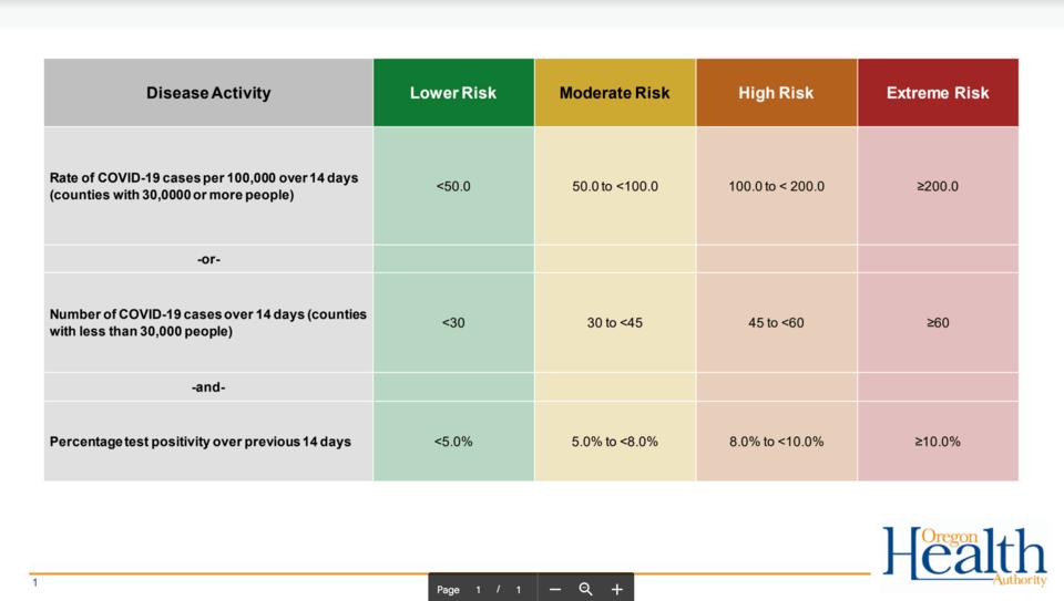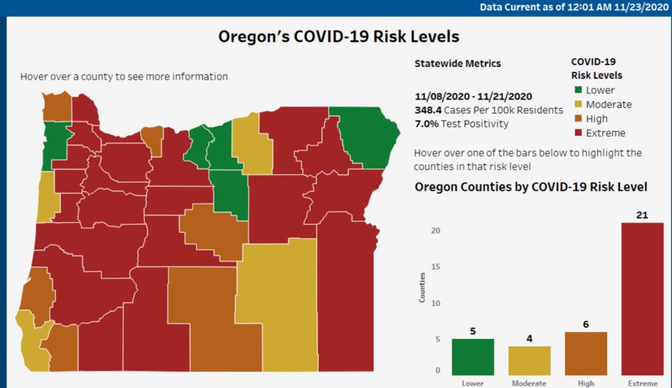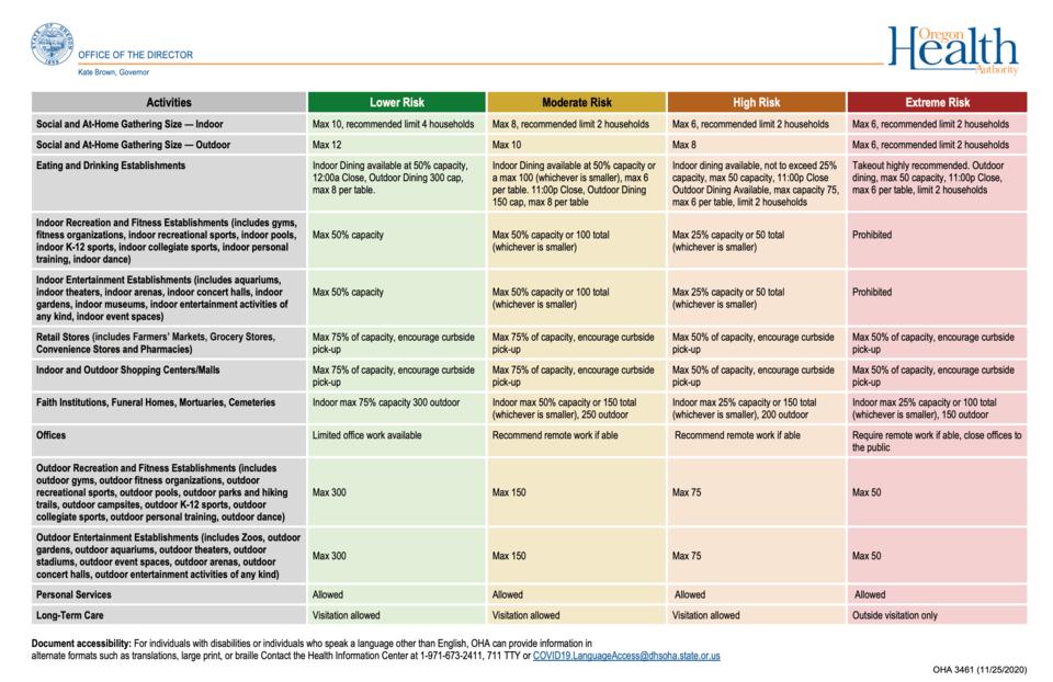 (Updated) Today, Oregon announced new guidelines to go into effect on December 3rd at the end of the freeze. Douglas County is currently listed as one of the 21 counties with a Covid-19 risk level of extreme. If our risk level remains extreme on December 3rd, the following guidelines will apply to us. - Restaurants and bars to reopen for outdoor dining only in “extreme risk” counties. Gyms can host outdoor fitness activities. - Religious organizations will be able to hold services at 25% capacity or with up to 100 people indoors or 150 people outdoors in these “extreme risk” counties. Current restrictions limit faith-based organizations to gatherings of no more than 25 people indoors or 50 people outdoors. - Retails stores and malls will be limited to 50% capacity. Currently, stores are limited to 75% capacity. This new restriction will mark one area where Brown is tightening requirements. - Social gatherings within households will continue to be limited to six total people, with a recommendation that no more than two households gather at a time. Oregon announced 1,189 new cases Wednesday and 20 new deaths. Here is the official release from the State of Oregon: (Salem, OR) — With COVID-19 cases and hospitalizations at an all-time high for the pandemic, Governor Kate Brown today urged Oregonians to remember that the entire state is under a Two-Week Freeze, and to keep their Thanksgiving gatherings small and use precautions to protect themselves and loved ones from the spread of COVID-19. With infection rates surging in Oregon, the Governor also cautioned that strict health and safety measures will likely need to remain in place for at least 21 counties found to be at extreme risk for COVID-19 spread following the Two-Week Freeze, which ends on December 2. “It’s been a long year — and one that has been exceptionally challenging for Oregonians,” said Governor Brown. “Not only have we been dealing with this pandemic, we also suffered through a heartbreaking and historic wildfire season. So many families have lost so much this year. Unfortunately, now, more than ever, is the time we must double down on our efforts to stop COVID from spreading. “When people don’t respect how serious this virus is, and when they act against the recommendations of doctors and public health experts, not only are they putting themselves at risk, they’re putting all of us at risk. Making smart choices — to wear a mask, to limit your social gatherings, to stay home when sick — will get us out of this horrible situation faster, and bring us closer to normal life, closer to reopening our businesses and keeping them open, and closer to getting our kids back in the classroom.” As the pandemic continues into the winter months, when cases are expected to continue to rise, the Governor announced a new health and safety framework, with four different risk levels for counties based on their level of COVID-19 spread, to take effect after the Two-Week Freeze ends on December 2. At each risk level — Extreme Risk, High Risk, Moderate Risk, and Lower Risk — health and safety measures and guidance for businesses and individuals will apply. The framework is intended to establish sustainable protection measures for Oregonians in counties with rapid spread of COVID-19, while balancing the economic needs of families and businesses in the absence of a federal aid package. On Monday, November 30, the Oregon Health Authority will reexamine county data to determine which counties qualify for each risk level on December 3, following the end of the 2-Week Freeze. In each subsequent two-week period, the Oregon Health Authority will examine and publish county data weekly, but county risk levels will not change until the end of the second week. In the first week, counties will be given Warning Week data to prepare for potential risk level changes. In the second week, county risk levels will be updated based on that week’s data. In counties with extreme risk, the following activities will be allowed, with health and safety protocols in place: Social and at-home gatherings with people from outside your household will be limited to a maximum of six people, with a recommended limit of two households. Restaurants, bars, and other eating and drinking establishments will be limited to a maximum of 50 people for outdoor dining only, with only six people per table. Take-out is strongly encouraged. Indoor recreation, fitness, and entertainment establishments, including gyms, will remain closed, however, outdoor recreation, fitness, and entertainment activities, including outdoor gym activities, will be allowed, with a maximum limit of 50 people outdoors. Retail stores, grocery stores, pharmacies, and indoor and outdoor shopping centers and malls will be limited to a maximum of 50% of capacity, with curbside pick-up encouraged. Faith institutions, funeral homes, mortuaries, and cemeteries will be limited to a maximum of 25% of capacity or 100 people indoors (whichever is smaller), or 150 people outdoors. Office workplaces will be required to utilize remote work to the maximum extent possible, with public-facing offices closed to the public. Personal services businesses will be allowed to continue to operate with health and safety measures in place. Long-term care facilities can allow limited outdoor visitation, following established health and safety protocols. Oregon counties that are successful in reducing their COVID-19 risk levels in the coming weeks and months will be able to incrementally move to lower risk levels. It’s important to note that there is no Zero Risk category. Until COVID-19 vaccines are widely available, health and safety precautions will remain in place so that schools, businesses, and communities can reopen, and stay open. At every risk level, to prevent COVID-19 outbreaks, Oregonians must continue to wear face coverings, watch their physical distance, wash hands, stay home when sick, and kee