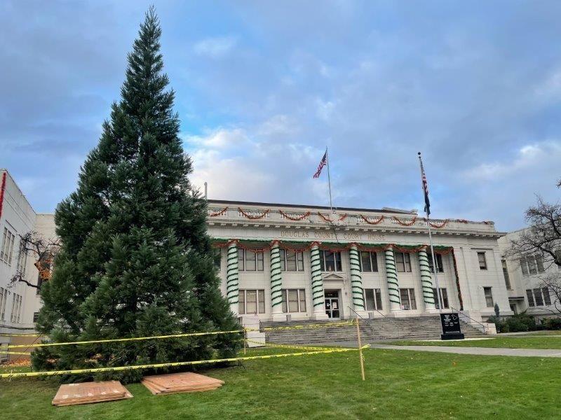 The Christmas Tree at the Douglas County Courthouse was planted in the front lawn Tuesday, as it will become a year round fixture for years to come. The decision to plant a live tree has been in the works for over four years. It was the idea of Commissioner Chris Boice and new Building Facilities Director, David Palmer who was able to make the idea into reality this year. The tree is a more sustainable option then previous years which involved the labor intensive practice of locating, cutting, hauling and placing a tree in the front lawn every year for Christmas. “This will undoubtedly be a different holiday season for many of our residents, so we wanted to do something extra special this year. Our Building Facilities staff have selected a beautiful evergreen tree to permanently grace the front lawn of the courthouse, and they are prepped and ready to make it glow bright with Christmas lights this year,” Commissioner Chris Boice said. “Our Christmas wish is that this tree stands as a symbol of joy, harmony, peace and hope for our residents and their families; not only this year, but for many generations to come.” The tree is being decorated with lights today. The tree came from Big Trees Today, a plant nursery in Hillsboro, Oregon. It was grown in their nursey and placed into the Courthouse front lawn in about 5 hour-time frame yesterday. The tree is about 9 years old, 30 feet tall and 15 feet wide at the base. It's species is a Hazel Smith Sequoia, that can grow to 60-75 feet tall and live for over 200 years. There will not be a traditional tree lighting ceremony this year. Instead, the Douglas County Christmas Tree Committee, consisting of the Douglas County Board of Commissioners, City of Roseburg and the Roseburg Town Center/Downtown Roseburg Association will simultaneously broadcast a pre-recorded virtual tree lighting program on Sunday, November 29, 2020, starting at 6:00 pm, on their respective Facebook pages for everyone to enjoy.