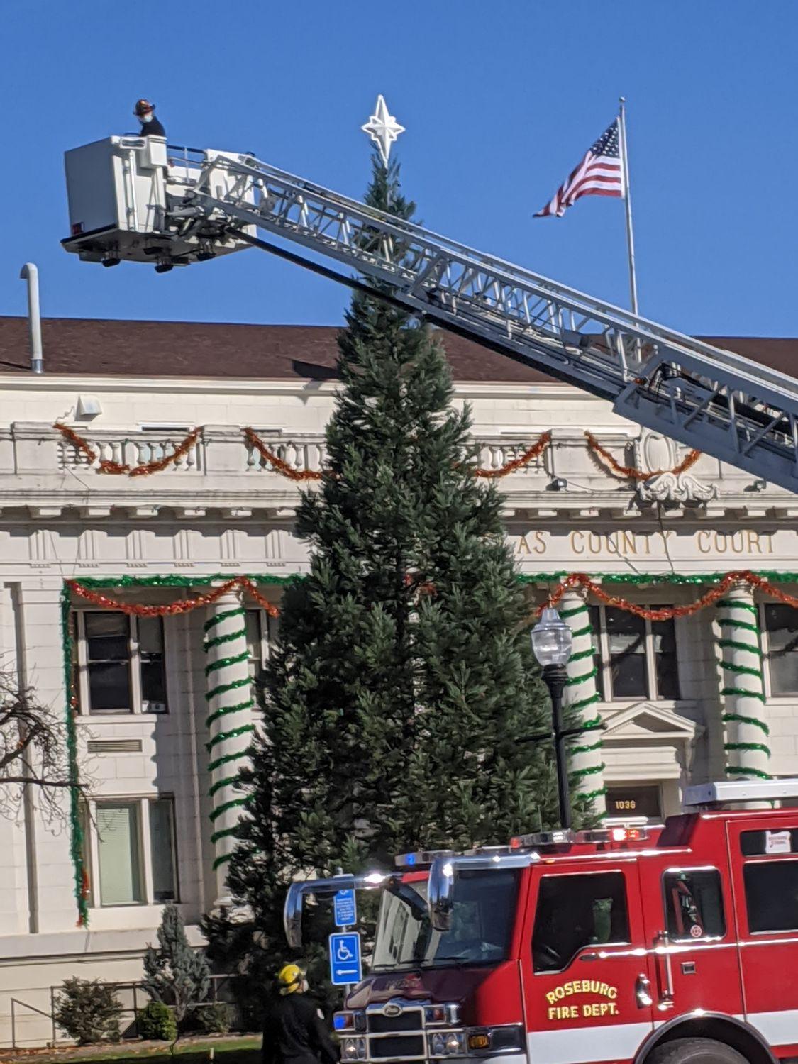 The star is on the new Christmas tree at the Douglas County Courthouse thanks to the Roseburg Fire Department's help! Photo by Sandi N Dean