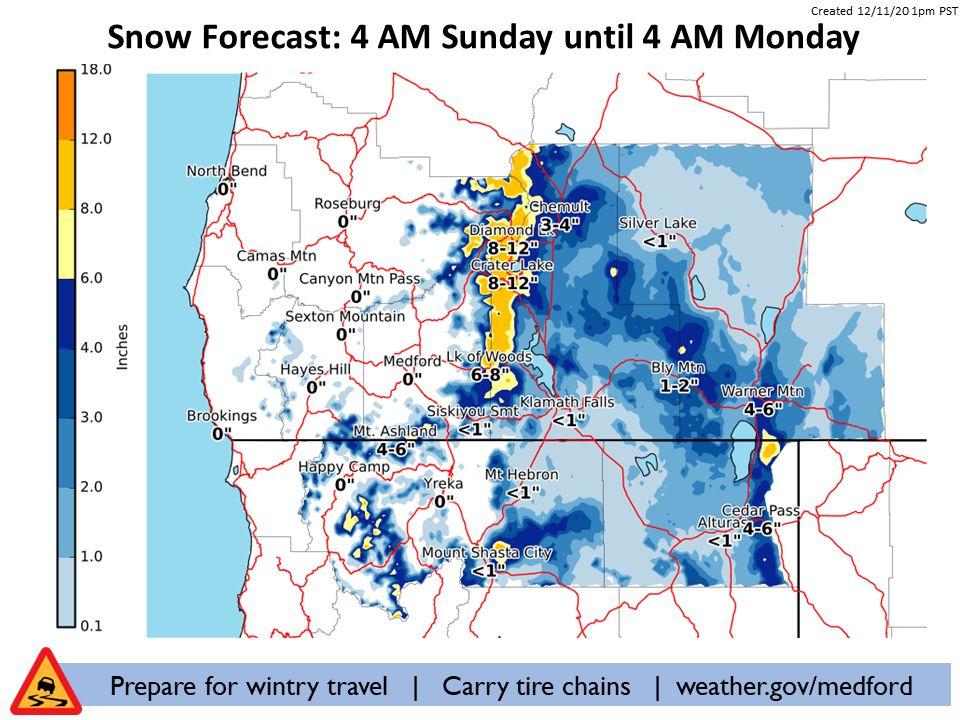 (NWS Medford) Significant snow is likely over mountain passes Sunday morning through Sunday night, especially over the High Cascades. 6 to 12 inches are possible over Cascades passes with 1 to 4 inches east of the Cascades (highest amounts near Chemult on Highway 97 and in portions of Modoc County). You can call 511 for Oregon road conditions and for California road conditions call 800-427-ROAD (7623) For current road conditions, check TripCheck https://tripcheck.com/Pages/Road-Conditions?curRegion=1