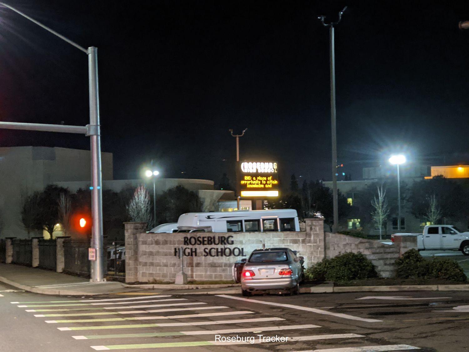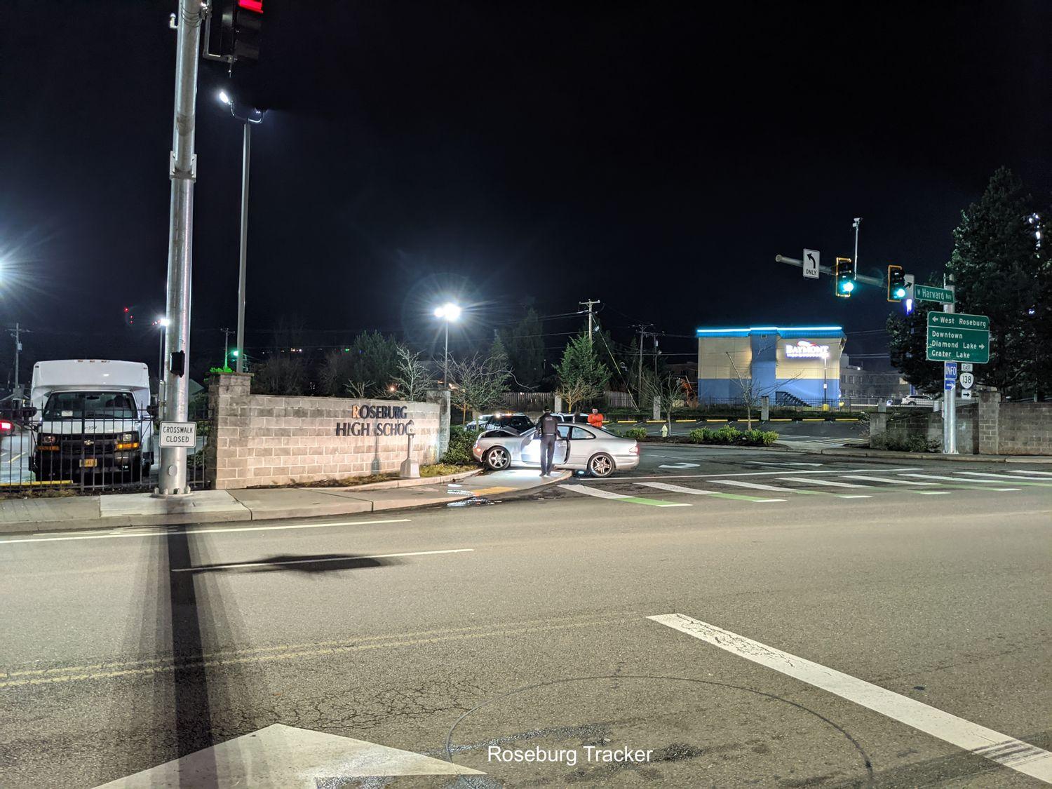 A car ran over the curb and hit the entry wall at Roseburg High School early Monday evening. Police were on-site investigating. The vehicle sustained a good bit of front end damage but the wall looked like it held up well in the collision. More details to come as they are made available.