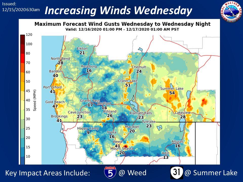 (NWS Medford) Significant snow is expected in the higher mountains Wednesday and Wednesday night. Snow levels will rise during the day with snow changing briefly to rain or a rain/snow mix in the late afternoon into the evening, then transitioning to snow again overnight.. Snow levels start at 4500 feet, then rise to 5500 to 6000 ft in the late afternoon and evening, before lowering again to 4000 ft overnight. Locations near Mount Shasta may only see slightly lower snow levels. Winds will increase Wednesday afternoon and remain gusty into Wednesday night. Some of the key impact areas include Interstate 5 at Weed and Highway 31 at Summer Lake with gusts to 40 mph at Weed and gusts to 55 mph at Summer Lake on Highway 31.