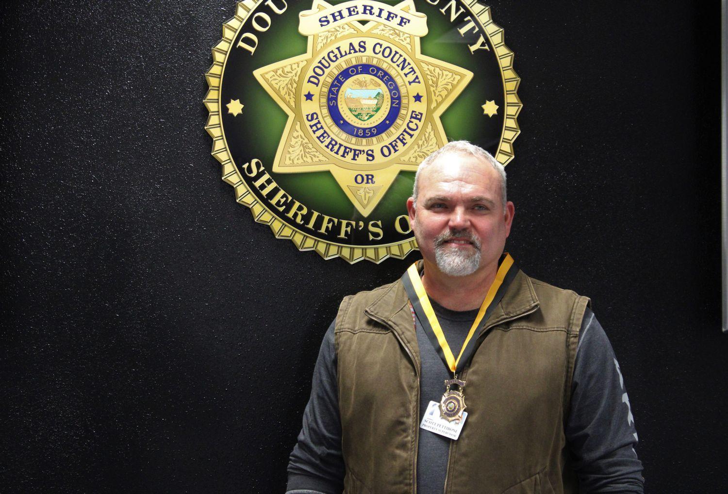 (DCSO) ROSEBURG, Ore. - A Myrtle Creek man was recognized by Sheriff Hanlin on Monday for actions he took in earlier this year at the scene of a vehicle crash in a small COVID compliant ceremony. On February 19, 2020, at approximately 7:00 PM, Scott Pettibone was traveling in the 2500 block of Canyonville Riddle Road when he observed the glow of a small fire off the side of the road. As he got closer, he realized the fire was the result of a vehicle which had caught fire after crashing head-on into a tree. Pettibone stopped his vehicle to investigate and observed the shadow of a person inside the crashed car. The driver of the crashed car was trapped in the vehicle and was pounding on the window screaming for help as the cab filled up with smoke. Despite the engine compartment and a portion of the cab being on fire; Pettibone was able to get the driver's side door open, remove the victim and carry him to safety on the other side of the road. Pettibone then returned to the car to check for additional victims before calling 911 at which time the vehicle became fully engulfed in flames. On Monday, December 21, 2020, Sheriff Hanlin presented Pettibone with the Sheriff's Citizen Medal of Valor for his actions. "Scott Pettibone demonstrated, in great degree, the qualities of selflessness and personal courage on that day," Sheriff Hanlin remarked. "There are no doubts that the victim would have perished in the vehicle fire if it weren’t for the decisive actions of Mr. Pettibone". Pettibone, age 49, received a medal and a pin for his actions. The Sheriff's Medal of Valor is is the most distinguished award presented to a civilian. Commissioners Tim Freeman, Chris Boice, Tom Kress and District Attorney Rick Wesenberg were in attendance at the presentation ceremony.