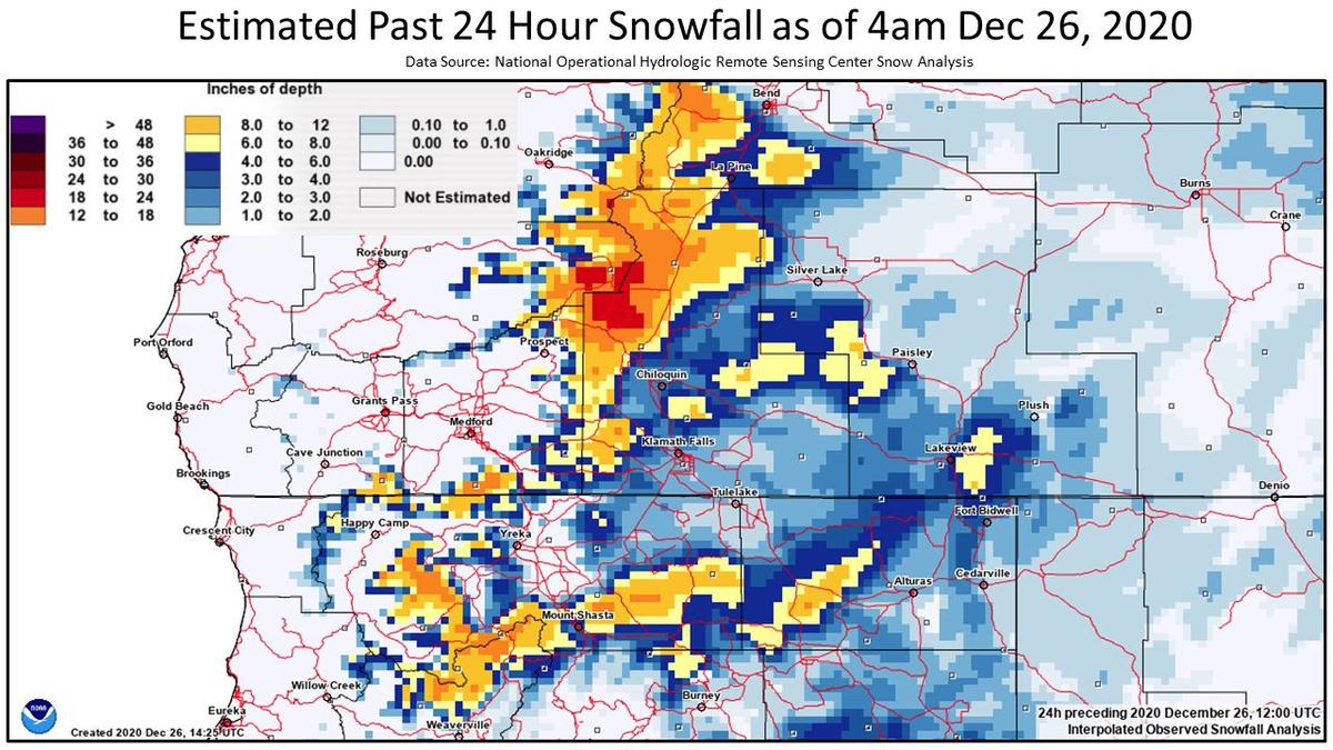Diamond Lake just received 9 inches of new snow on Christmas day into this morning. There is now a base of 17 inches or so in the low lying areas. Diamond Lake Resort is open for takeout food and now can also serve alcoholic beverages to go. The tubing hill is sold out for today, just a heads up. Here is the latest forecast discussion from the NWS in Medford https://www.wrh.noaa.gov/total_forecast/getprod.php?new&prod=XXXAFDMFR&wfo=mfr