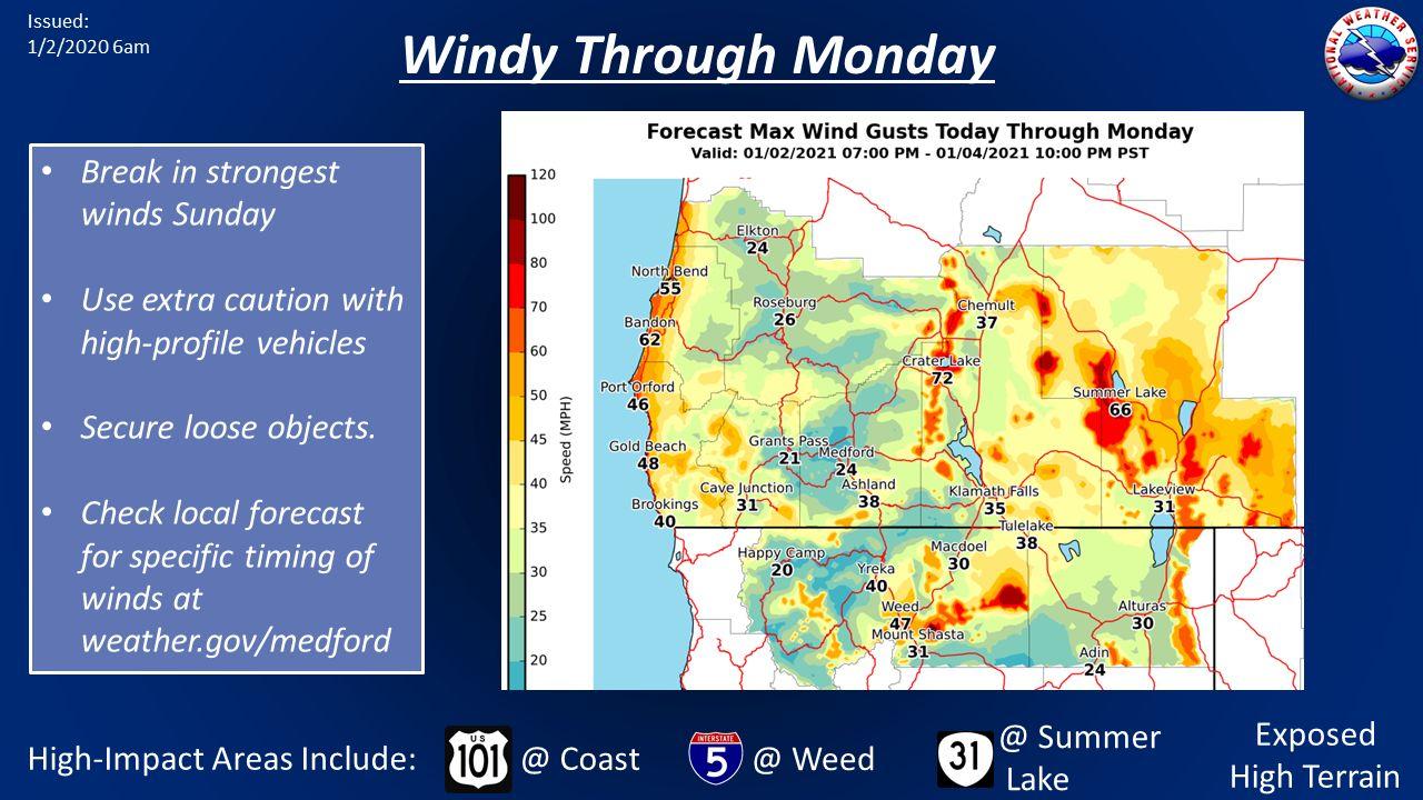 (NWS Medford) Winds between 20-30 mph with gusts up to 55 mph can be expected in parts of Douglas County starting at 4 pm Saturday afternoon through 1 pm on Monday. Here is the official wind advisory from the National Weather Service. ...WIND ADVISORY NOW IN EFFECT FROM 4 PM THIS AFTERNOON TO 1 PM PST MONDAY... * WHAT...South winds 20 to 30 mph with gusts up to 55 mph expected. The highest and most exposed terrain in the coast range may see gusts up to 70 mph on Sunday night. * WHERE...Southern Douglas County and Eastern Curry County and Josephine County including Highway 199 near Selma, Azalea, Glendale, Sexton Pass on Interstate 5. * WHEN...From 4 PM this afternoon to 1 PM PST Monday. A break from the winds is expected Sunday morning through Sunday evening. * IMPACTS...Gusty winds could blow around unsecured objects. Tree limbs could be blown down and a few power outages may result. Driving will become difficult, especially for high profile vehicles. * View the hazard area in detail at https://www.wrh.noaa.gov/mfr/HAZARD