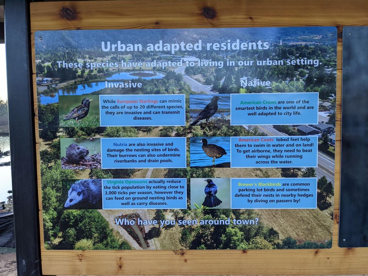 A new information kiosk and educational signs have been installed at the ponds in Stewart Park by Fred Meyer. One of the goals of the project was to help the community learn more about all the animals and birds that frequent the ponds and natural area. The project has been a collaboration of several local organizations and individuals. The City of Roseburg Parks Department, Wildlife Safari, Umpqua Valley Audubon Society, and ODFW. Romtec, a local manufacturer helped contribute the very nice kiosk that is home to the new information signs. Big thank you to Leila Goulet, Diana Wales, Kris Ammerman, Matthew Hunter, Brendon Demuth, Tracy Pope, William Cannaday, Beth Brown, Bill Fuller and Cory Dooley for all your contributions and work! There are still several improvement projects being worked on and I will keep you updated as those progress in the coming year.