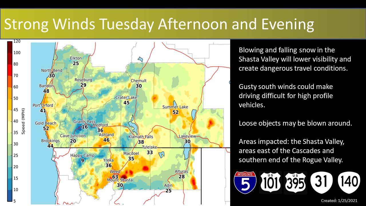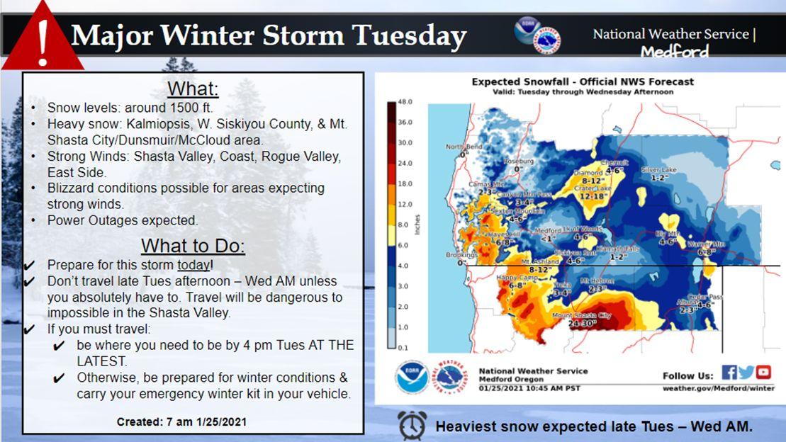 A significant storm is set to hit Oregon starting tomorrow into Wednesday with very high winds. Southern Oregon and the Oregon Coast will be the hardest hit areas. Douglas County Could see winds as high as 29 mph. Between the high winds and the snow, travel to southern Oregon should be avoided if at all possible in the next few days. Here is the latest forecast discussion from the NWS in Medford. SHORT TERM...With a shortwave upper trough in place, scattered showers are continuing today from the Cascades west. Showers will linger through evening with snow levels near 2000 feet, then diminish tonight. The break in the activity will be very brief. Models remain on track showing a strong and moist, cold low pressure system dropping out of the Gulf of Alaska tonight, shifting south just off the Pacific Northwest coast. This will be a significant weather system with impacts from heavy snow across much of Siskiyou and portions of eastern Curry and Josephine Counties (heaviest for 1500 feet elevation and above). Strong, gusty winds are expected over the mountains, in the Shasta Valley and at coastal headlands. On Tuesday, models are on track, showing good agreement with a 997 mb surface low moving south of the coast of Washington and Oregon. As this low nears the area, it will bring a front into the coast Tuesday afternoon. Then as the surface low moves southward just off the southern Oregon and northern California coast, this front will shift inland and gradually to the southeast Tuesday evening and night. This system will bring significant impacts with moderate to heavy snow over portions of southwest Oregon and northwest California along with some locations seeing strong, gusty winds. A strong mid level jet associated with this low pressure system will move into the area. Models show 700 mb winds of 60 to 75 kt out of the southwest moving into the area Tuesday afternoon and evening. At the surface, a strong pressure gradient will develop (9-11 mb from Medford to Redding) which will allow strong south winds to develop in the Shasta Valley with gusts to around 60 to 70 mph. Gusty winds are also likely in the Rogue Valley, especially south of Medford to Ashland, with gusts of around 35 to 45 mph. Gusty winds are likely from the Cascades east as well with winds of 30 to 45 mph in the valleys and 45 to 60 mph over the ridges. In the Rogue Valley, these winds may be accompanied by a rain/snow mix or snow at times, especially Tuesday evening into Tuesday night for areas above 1500 feet elevation. A wind advisory is in place for the Summer Lake area in Lake County late Tuesday afternoon through early Wednesday morning (Please see the NPWMFR for details). With this storm system, heavy precipitation rates will develop in Curry, Josephine and Siskiyou counties late Tuesday afternoon into Tuesday night. This combined with a cold air mass in place will result in heavy, wet snow developing across these area. There is high confidence for very heavy, wet snow in the Mount Shasta area where strong upslope southerly winds will combine with moisture. Heavy snow rates of up to 1 to 2 inches per hour are expected at times, especially late Tuesday afternoon into Wednesday morning. Total snow accumulations of 2 feet or more is expected in the south central and southeast Sikiyou County area near Mount Shasta from Tuesday afternoon through Wednesday afternoon. Heavy snow rates are expected to extend into the southern Shasta Valley as well where heavy snowfall combined with strong winds (gusting to 60 to 70 mph) will bring blizzard-like conditions at times with near zero visibility. This will make roads impassible at times. Moderate to heavy snowfall will then continue Wednesday morning into Wednesday afternoon for these areas in Siskiyou County. A winter storm warning is in effect for this area. This is a very dangerous situation and travelers are urged to make plans to avoid travel during winter storm conditions. Other areas will also snow impacts. Across western Siskiyou, Josephine and eastern Curry Counties models indicate moderate to heavy snow is expected, with heaviest snow expected above 1500 feet elevation and lighter snow amounts down to lower valley floors. Although not as heavy or as long of a duration an event compared to the snow in the Mount Shasta area, the lower passes and valley locations (above 1500 feet) are expected to see a period of heavy snow rates as this front moves inland. Elsewhere across the CWA, areas of light to moderate snow are expected, including in western valleys above 1500 feet, over the mountains and for areas from the Cascades east. Heaviest snowfall is expected Tuesday evening through early Wednesday morning for these areas. Please see the WSWMFR for details on the snow and blowing snow expected in the area Tuesday into Wednesday. On Wednesday,the front will shift southeast of the area. However the surface low off the coast of southern Oregon and far northern California, will remain in place, gradually moving northward along the coast Wednesday evening and night. With this low in place, expect additional moderate to locally heavy precipitation across southwest portions of the CWA, heaviest in Curry and Siskiyou Counties and possibly into southern Josephine County. This will bring continued impacts from snow for these areas through Wednesday morning (and through Wednesday afternoon for the Mount Shasta area). Confidence is low in how much snow the lower west side valleys may see Tuesday night into Wednesday morning due to uncertainty in how much precipitation will occur and how widespread showers will be. Snow levels are expected to lower down to between 500 to 1000 feet during this time. However, precipitation may remain light across western valleys during this time. Precipitation may increase in the afternoon on Wednesday across Josephine County. However, snow levels are expected to rise to 2000 ft or higher at that time. Wednesday evening and night, an upper low will move dow