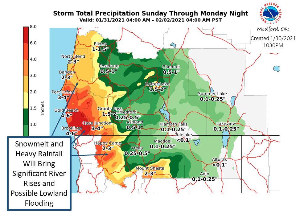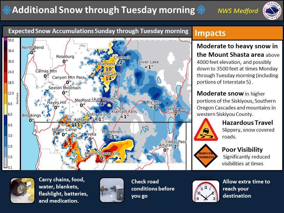 Douglas County could see as much as an inch of rain over the next day or so. In the Cascades, Diamond Lake could see as much as 10 inches of new snow. Winds in Douglas County will be moderate in the low lying areas, but very gusty at some of the higher elevations, especially at the coast and up in the mountains. NWS - Flood watch for some areas Flood Watch in effect for Sunday Morning through late Monday night. Heavy rains with some snow melt will bring sharp river rises and swollen creeks and streams. Flooding possible across small rivers, streams and creeks and low lying areas. Stay alert and don't drive across flooded roadways. Turn around don't drown! NWS - Snowfall - Moderate to heavy snow accumulations are expected through Tuesday morning with the heaviest snowfall accumulations expected in the Mount Shasta area. Heaviest snow in the Mount Shasta area is expected above 4000 feet elevation, but moderate to heavy snow may impact elevations down to 3500 feet at times Monday through Tuesday morning. Also moderate to heavy snow is expected in the higher mountains in western Siskiyou County. Light to moderate snow is expected in the Siskiyous and Southern Oregon Cascades. Be prepared for winter travel conditions with slippery roads and poor visibilities. Here is the latest forecast discussion from the NWS office in Medford. https://www.wrh.noaa.gov/total_forecast/getprod.php?new&prod=XXXAFDMFR&wfo=mfr