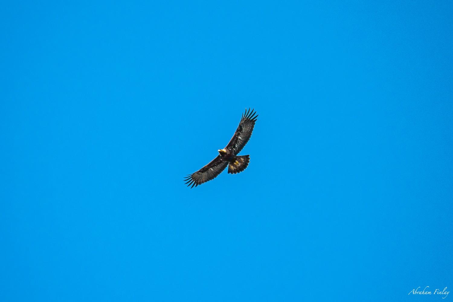 The Golden Eagle can be found all across the United States and also around Douglas County. A good place to look for Golden Eagles is out Diamond Lake Boulevard and any large wide open fields. The Golden Eagle is often seen soaring over large fields, canyons, forests, and large mountains ranges. Golden Eagles eat primarily medium sized mammals like rabbits, prairie dogs, jackrabbits, and hares. Golden Eagles nest on cliffs and sometimes in tall trees. A Couple of my favorite things about this raptor is its golden head and 7 foot wingspan. Photo taken 3-23-21 flying over Roseburg in Douglas County Photo by Abraham Finlay