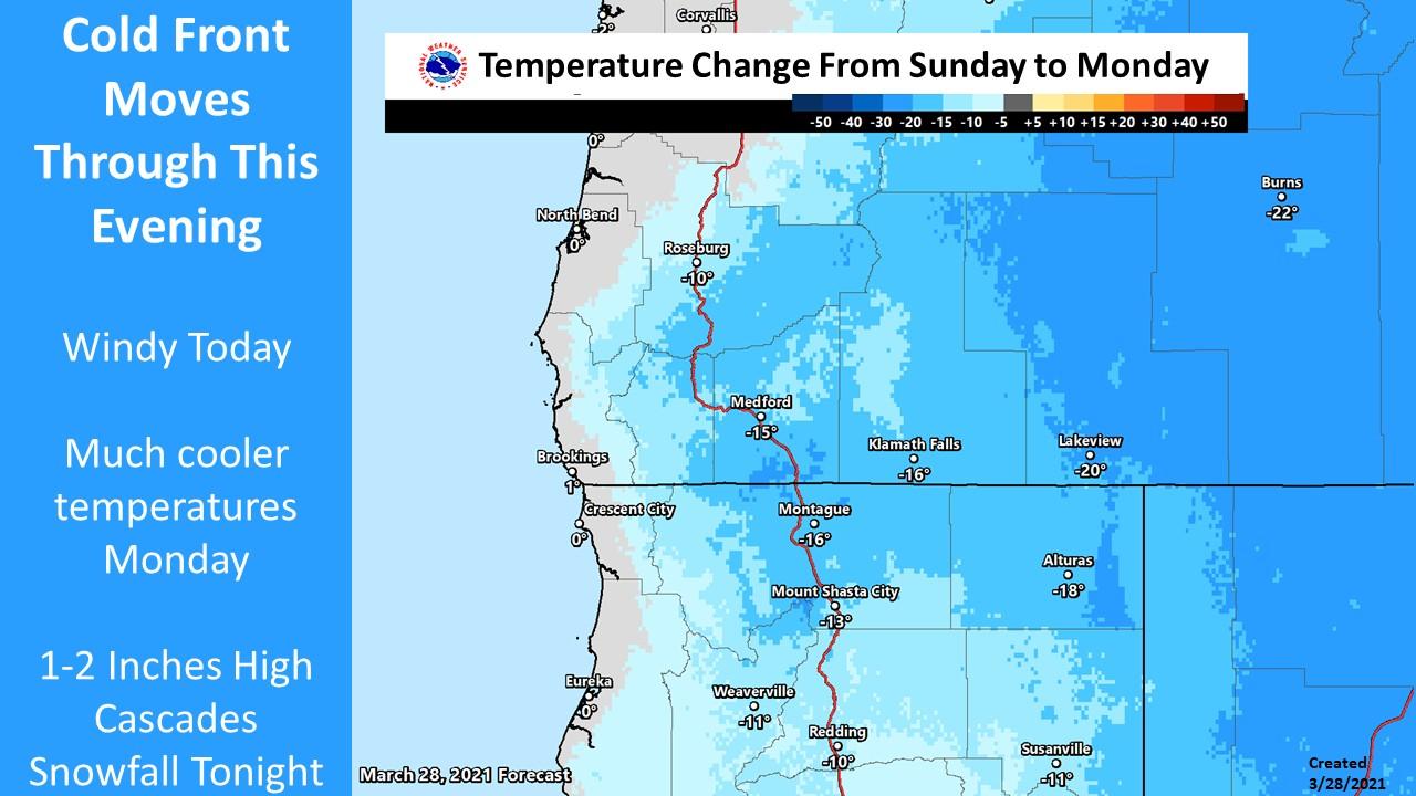 Temperatures are going to drop into the low 30's tonight and then again Monday night. We might see a little rain later this evening but then it should be sunny most of the week. Here is the latest forecast discussion from the NWS in Medford; https://www.wrh.noaa.gov/total_forecast/getprod.php?new&prod=XXXAFDMFR&wfo=mfr
