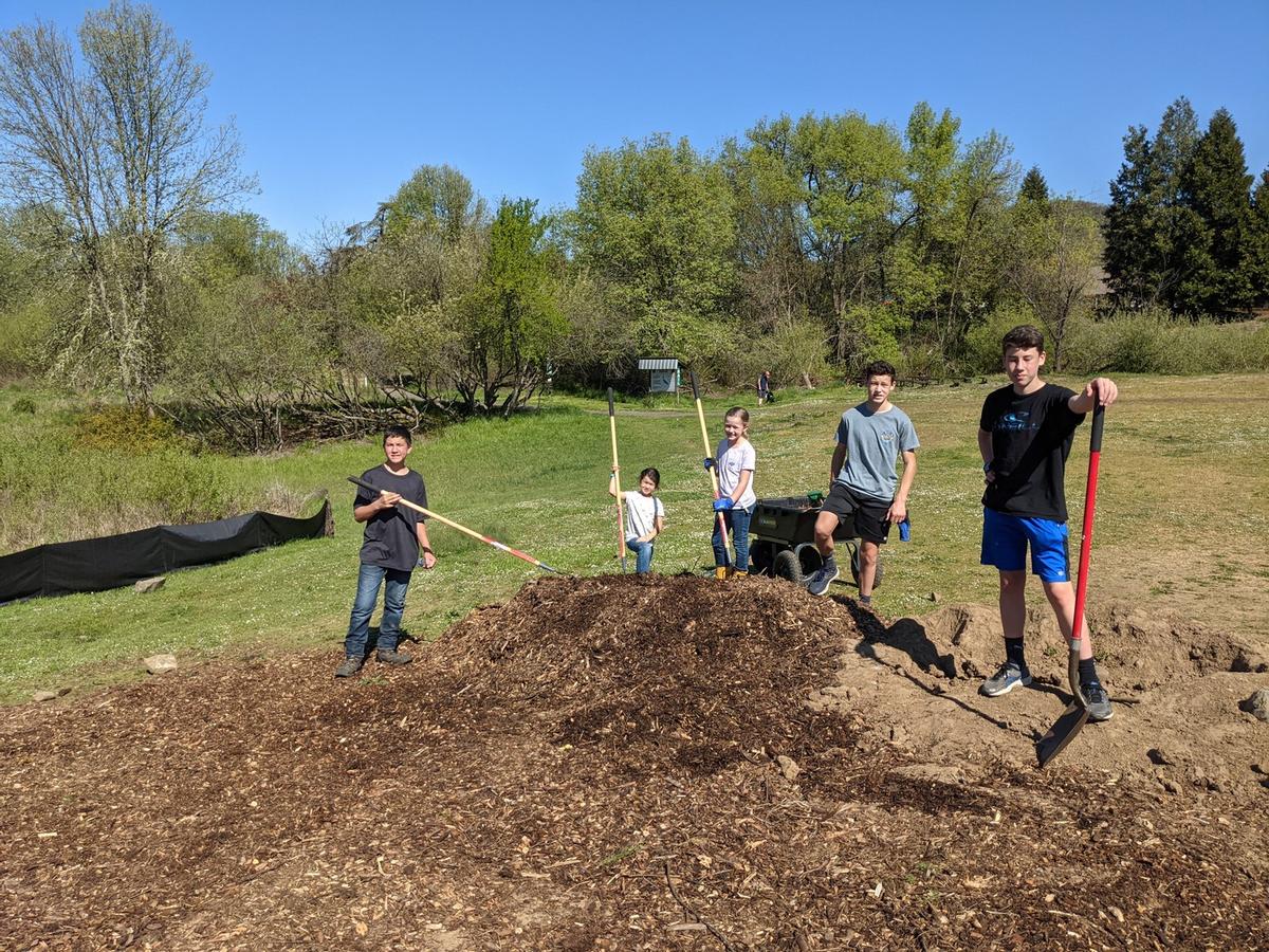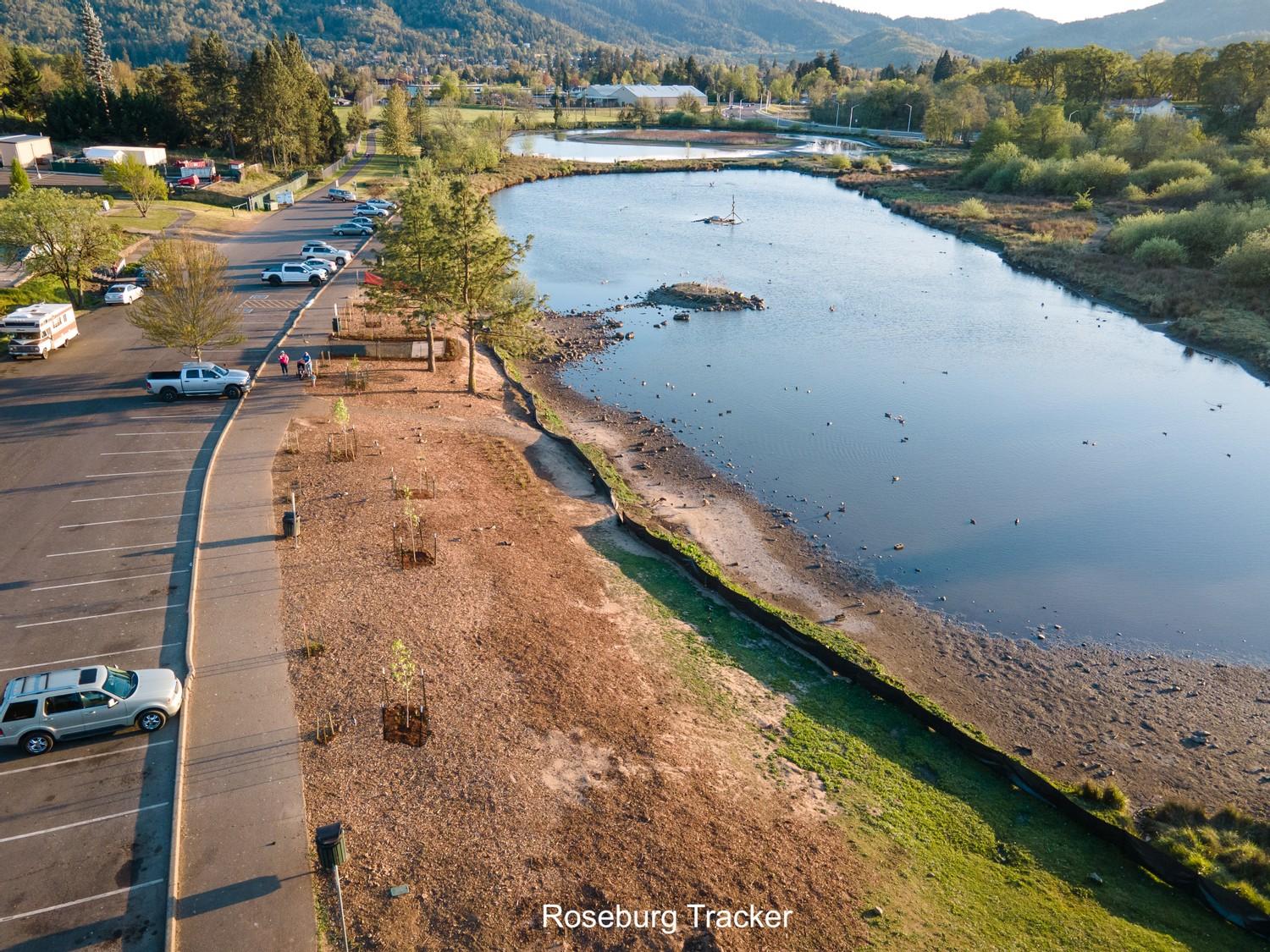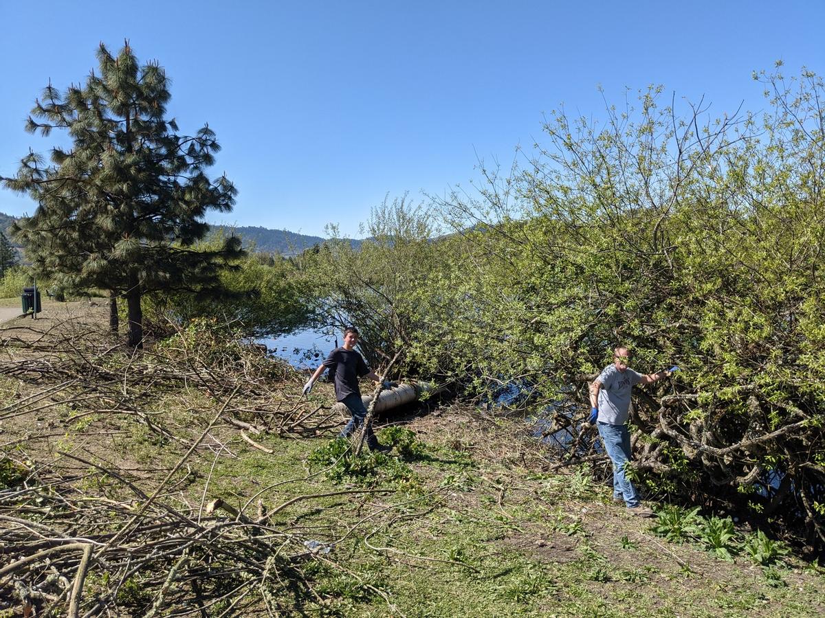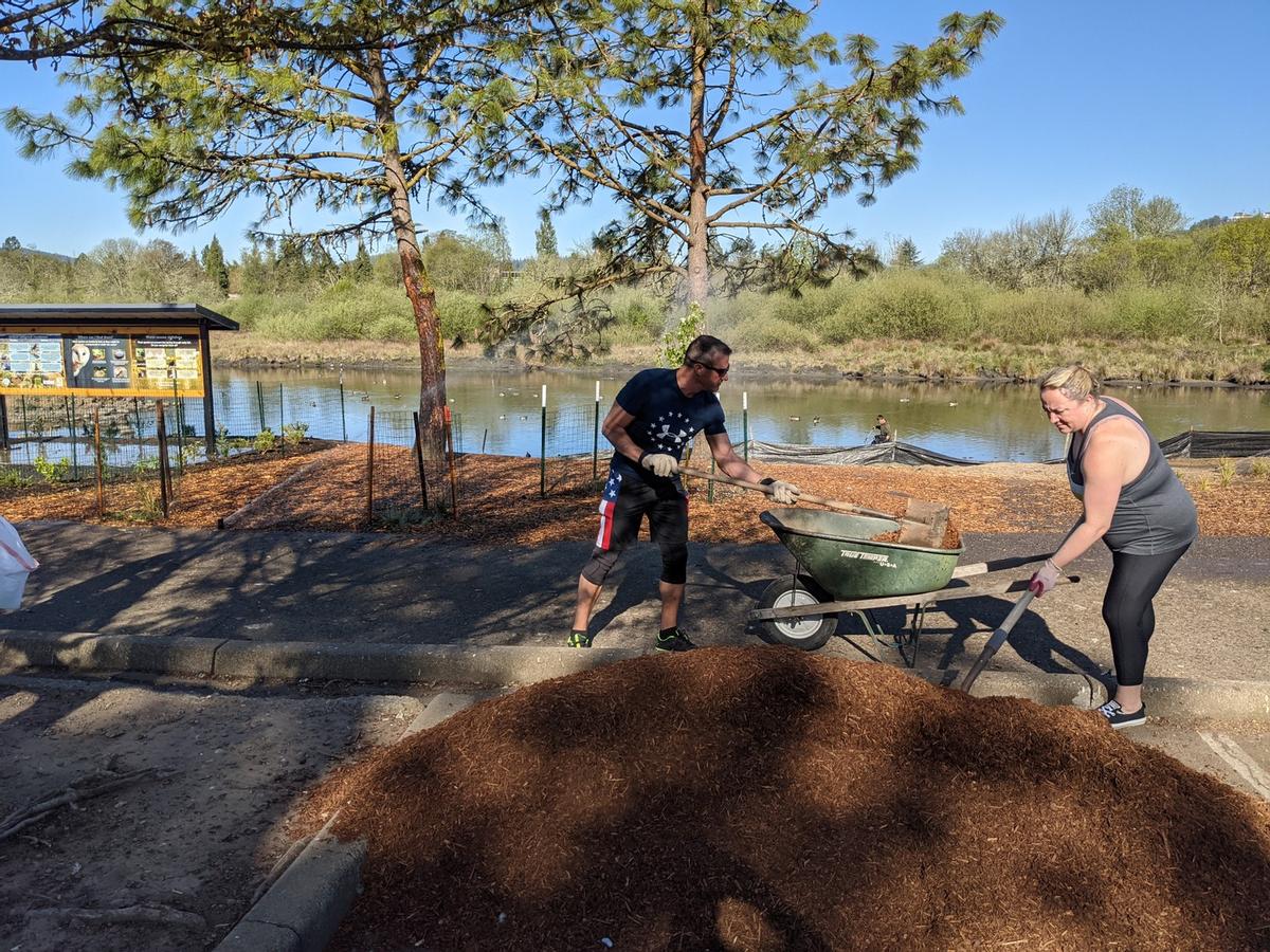 Eleven volunteers showed up on Saturday morning to continue several projects being worked on at the ponds in Stewart Park. More bark chips were spread out in front of the north pond to help the area retain moisture, especially around the new plants that were recently put in. Bark mulch was spread around the new plants and flowers by the information kiosk to help keep moisture in and ground surface temperatures down to help the new plants get established going through the summer. Lots of pruning also took place removing invasive plants and blackberry bushes in the area. The group was able to fill a 20-yard dumpster full. We also were able to paint the observation deck between the north and south pond. It was also an exciting day as the new irrigation for the area is now up and running to keep all the new plants and trees watered through the spring and summer! Big thank you to all the volunteers that showed up and helped out, to Luann Urban for providing refreshments and support, and City of Roseburg Parks Department workers for their support in pulling this off. We are making lots of progress and it’s really starting to come together! There will be more work days coming up and we’ll keep you posted!