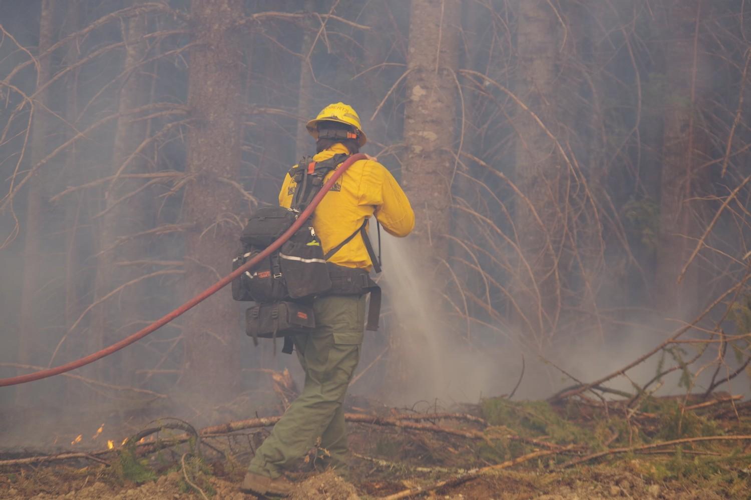 (DFPA) Firefighters working on the Marshall’s Place Fire, located four miles north of Tiller, took advantage of favorable conditions overnight and made good progress towards containing the blaze. Crews reported that fire activity significantly decreased Tuesday evening after sunset due to increased humidity levels and decreased wind speeds. Hand crews and bulldozers assigned to the incident continued to work on the fire overnight and completed containment lines around the entire perimeter of the Marshall’s Place Fire by early Wednesday morning. The Marshall’s Place Fire is estimated to be around 200 acres in size, however, more accurate mapping will be conducted in the coming days. Today, 110 personnel from the Douglas Forest Protective Association, Oregon Department of Forestry, Coos Forest Protective Association, industrial landowners, and private contractors are assigned to the fire. Crews and equipment will be focused on mopping up hot spots within the perimeter of the fire in addition to holding and improving containment lines. Smoke from the interior of the fire may be visible for the next couple days. The cause of the Marshall’s Place Fire remains under investigation.