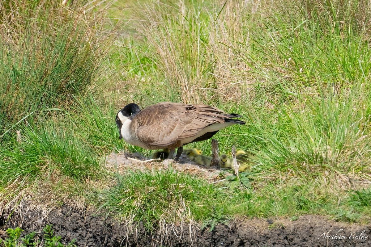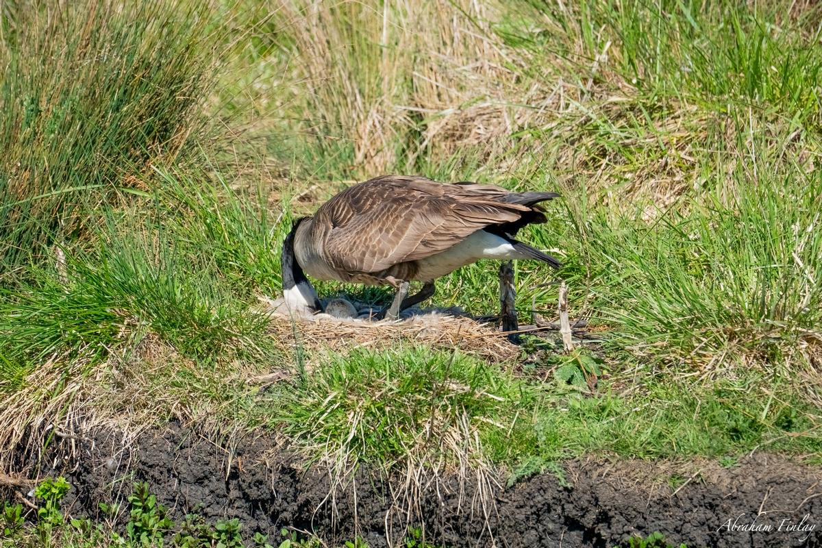 Around April 12th, I captured these photos of a mother Canada Goose sitting on her eggs in Stewart Park. A couple of weeks later, I returned and captured photos after they hatched and were exploring everything around their nest. Canada Geese lay 5-10 white eggs and incubate the eggs for 25-30 days. These geese eat mostly aquatic insects and plants.