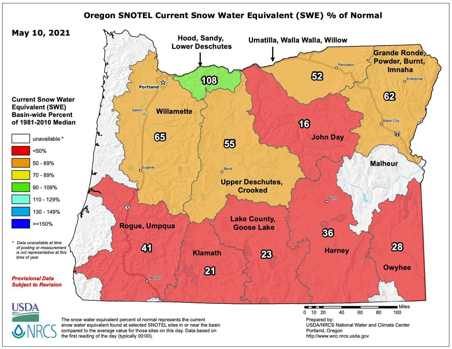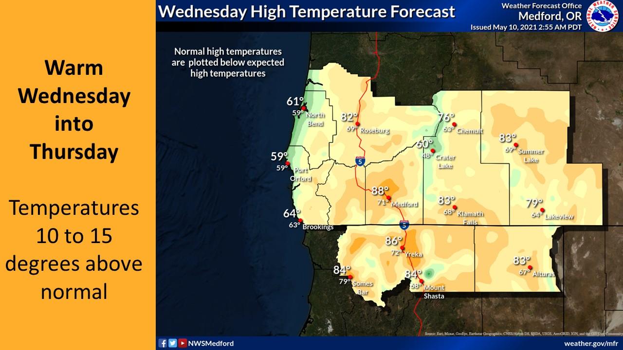 More warm temperatures are heading our way this week. Temperatures could reach the mid to low 80's by Wednesday and Thursday in Douglas County before cooling down a bit. Here is the latest from the NWS out of Medford. "Temperatures will peak this week on Wednesday and Thursday with high temperatures expected to be 10 to 15 degrees above normal for most inland areas." Our drought conditions meanwhile continue to worsen. As you can see from the image below, we are now down to 41% of our normal snow water equivalent. Here is their latest discussion: https://www.wrh.noaa.gov/total_forecast/getprod.php?new&prod=XXXAFDMFR&wfo=mfr
