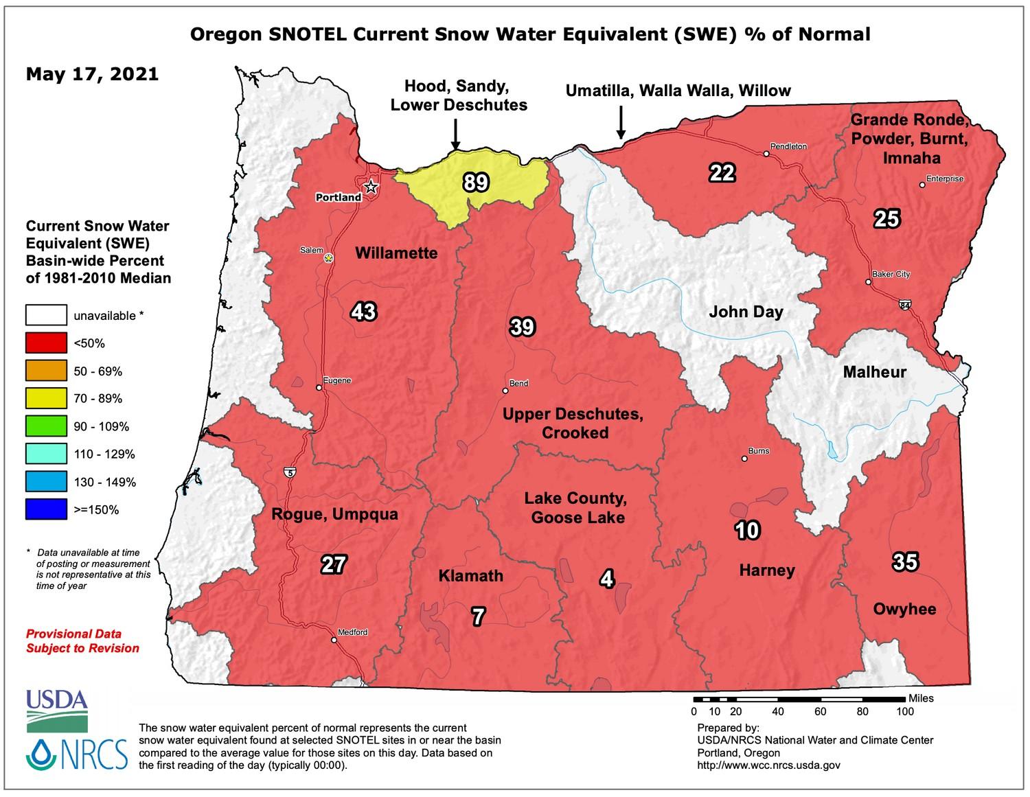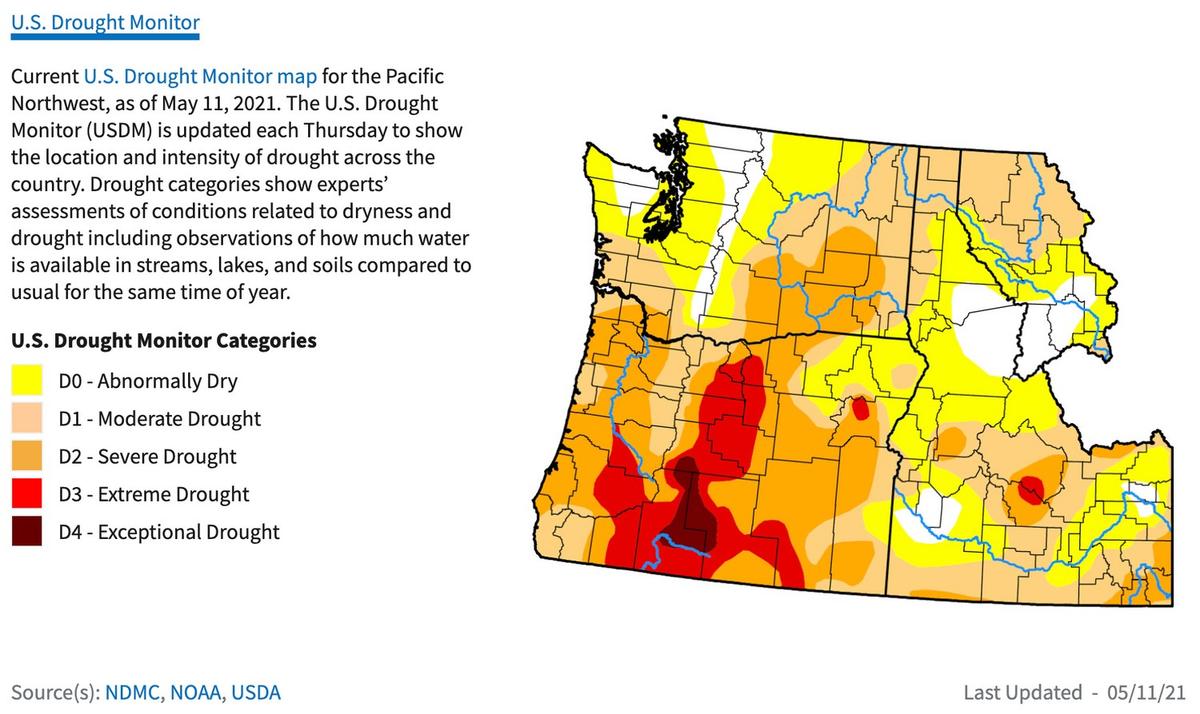 Drought conditions continue to worsen in Douglas County and across the state of Oregon. Oregon had the second driest March and April dating back to 1895. Unfortunately, drought conditions are predicted to get much worse in the months to come. Current snow water equivalents are now down to 27% of normal. Here are some of the impacts listed by the drough.gov website: "The Significant Wildland Fire Potential Outlook shows higher chances of wildfire potential east of the Cascade crest throughout Oregon and into southwest Washington by June and July. Impacts are being felt across the region with poor pasture and rangeland conditions, reduced irrigation, more spring season fires than previous years, poor crop conditions, and the need to haul water or move livestock out of drought-impacted areas." For more information, as well as drought maps and charts visit the drought.gov website here: https://www.drought.gov/drought-status-updates/drought-status-update-pacific-northwest