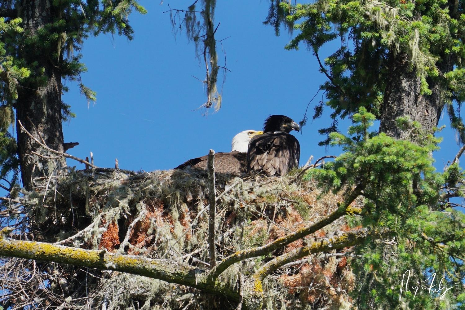 It was great to see another generation of Bald Eagle this morning. The Bald Eagle on the left in the photo is the parent, as they get their full white head once they are 5 years old. Their head is speckled white until about 2 1/2 years old, then their head really starts getting more white. The juvenile on the right is about a few months old.