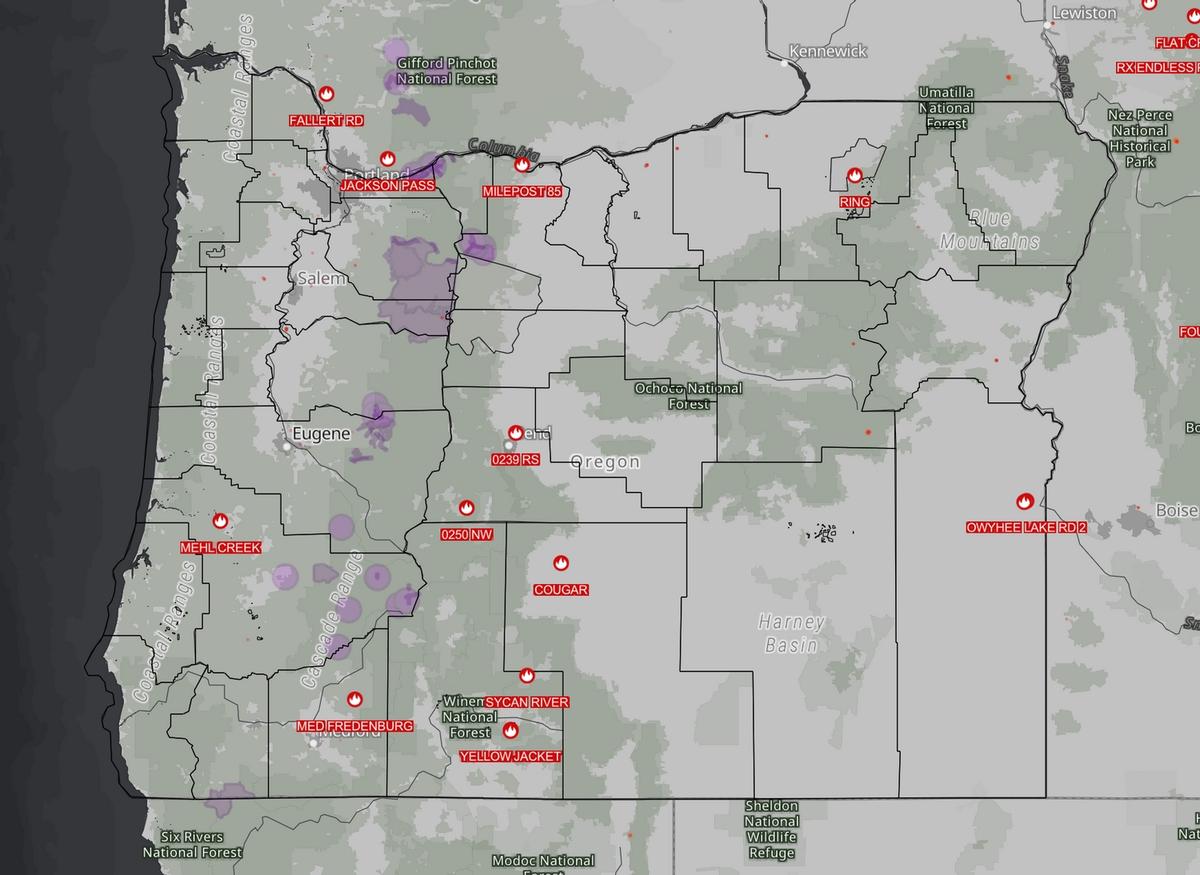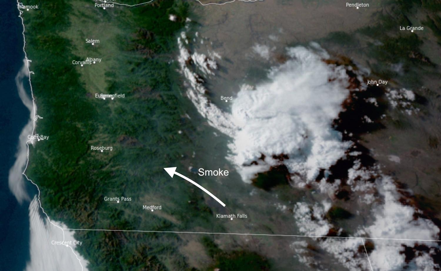 I heard from a few people they started smelling smoke today. I believe that is from the Sycan River fire, a 650-acre fire down near Klamath Falls that is 30% contained. The wind shifted and the satellite showed the smoke move into our area today. The second image shows all the fires in Oregon right now. The third image shows how bad drought conditions are at the moment.