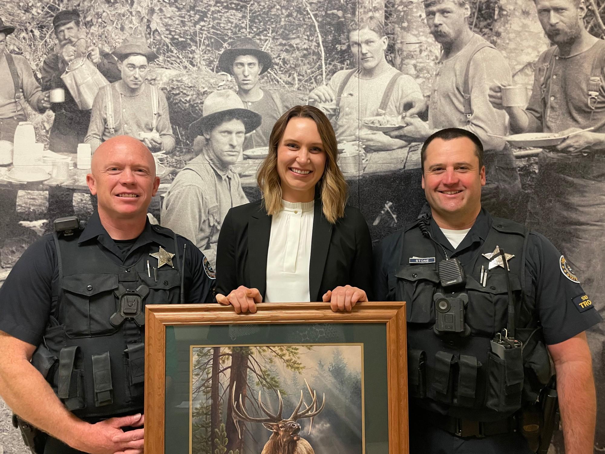 The Douglas County Board of Commissioners was honored to host a special presentation on June 2, 2021, during their Weekly Business Meeting held at the Douglas County Courthouse. Troopers from the Oregon State Police (OSP) – Fish and Wildlife Division joined the meeting and presented Douglas County Senior Deputy District Attorney, Allison Eichmann with their prestigious 2020 Wildlife Prosecutor of the Year Award. Each year, OSP – Fish and Wildlife Division presents a series of awards that honor the service of individuals during the previous year. Individuals are nominated by OSP Officers, those nominations are reviewed by a panel of OSP Officers, who then select the award recipients for their annual awards, including Trooper of the Year, Fish and Wildlife Team of the Year, Partner of the Year, and Prosecutor of the Year. The Prosecutor of the Year award recognizes an individual prosecutor’s commitment to the conservation of Oregon’s wildlife and goes to someone who has excelled in the prosecution of fish and wildlife cases. The award, which includes a framed artwork of a wildlife scene, is made possible by the Oregon Sportsman’s Coalition. “This year, we received multiple nominations for Prosecutor of the Year from various OSP offices around the state. Our OSP review panel unanimously selected this year’s prosecutor of the year award winner, Douglas County’s Senior Deputy District Attorney, Allison Eichmann,” stated OSP Lieutenant Vonn Schleicher, the Southwest Region Lieutenant of the Fish and Wildlife Division, during his presentation speech. Eichmann was nominated by Roseburg OSP – Fish and Wildlife, Senior Trooper Baimbridge and Senior Trooper Stone in recognition for not just last year, but for the outstanding and ongoing work she has done in assisting them with the prosecution of wildlife cases in Douglas County. “We like to call Allison our DA because she cares about Fish and Wildlife laws, she has taken the time to understand how to prosecute our unique cases very well, she makes herself available for team meetings and presentations, and has taken a personal interest in valuing our local wildlife community,” commented Senior Trooper Baimbridge. Attending the presentation from the OSP – Fish and Wildlife Division was Captain Casey Thomas, from Salem, who is the Captain of the Fish and Wildlife Division; Lieutenant Vonn Schleicher, from Springfield, who is the Southwest Region Lieutenant of the Fish and Wildlife Division; and Sergeant Bowersox, Senior Trooper Baimbridge, Senior Trooper Stone and Trooper Bachmeier, all from the Roseburg OSP Office. Also attending the ceremony was Rick Wesenberg, the Douglas County District Attorney. “To have one of our own be selected as a recipient of such a statewide honor is tremendous. It is a testament to all the hard work that our staff here in Douglas County does every day. Allison does an exceptional job for the county, and we are proud of all the work she has done and continues to do in the Douglas County District Attorney’s Office,” stated Commissioner Tim Freeman. Via Douglas County Government