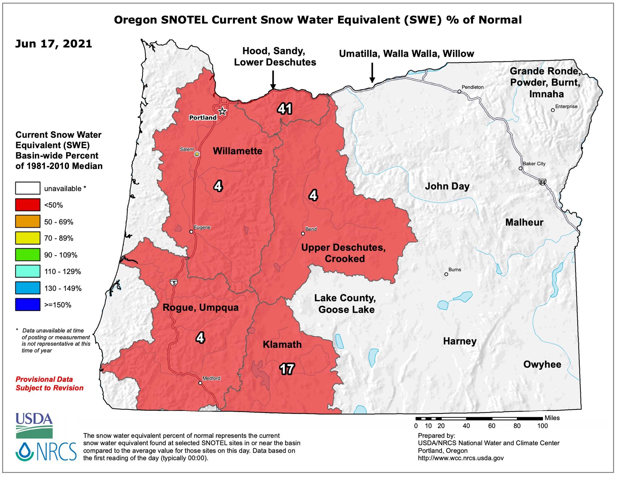 We are now down to 4% or normal Snow Water Equivalent for our area for this time of year. Very hot temperatures on the way over the next 10 days, with temps reaching close to 100 degrees on Monday according to the latest forecast. Here is the latest SWE map for Oregon: https://www.wcc.nrcs.usda.gov/ftpref/data/water/wcs/gis/maps/or_swepctnormal_update.pdf