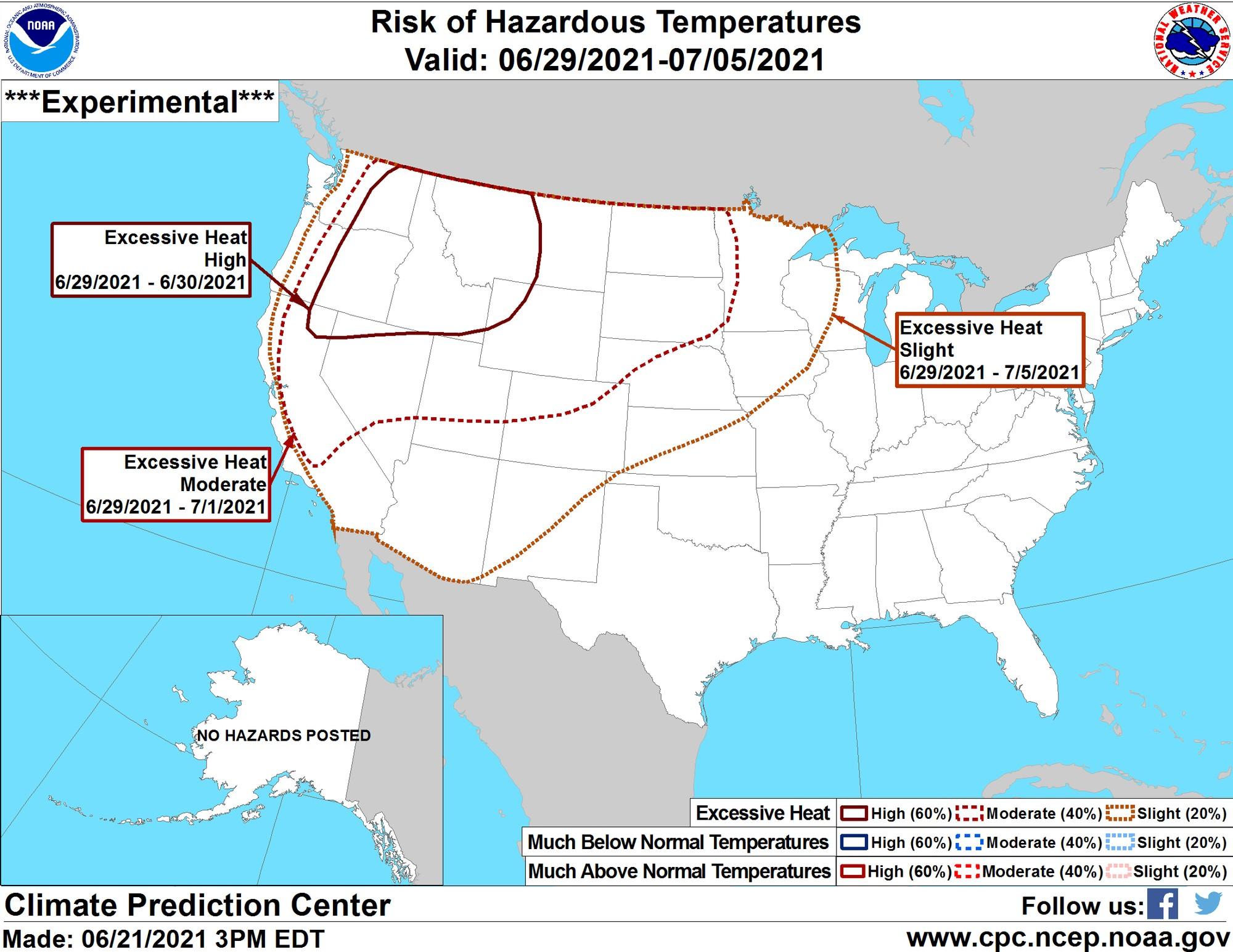 The latest outlook from NOAA shows excessive heat as a possibility through the end of June now. This weekend, we are looking at temperatures over 100 degrees for both Saturday and Sunday. Here are the latest high-temperature predictions for the next 10 days. Tuesday 89 Wednesday 88 Thursday 92 Friday 95 Saturday 102 Sunday 103 Monday 96 Tuesday 93 Wednesday 94 Here is the latest forecast discussion from the NWS out of Medford: https://www.wrh.noaa.gov/total_forecast/getprod.php?new&prod=XXXAFDMFR&wfo=mfr