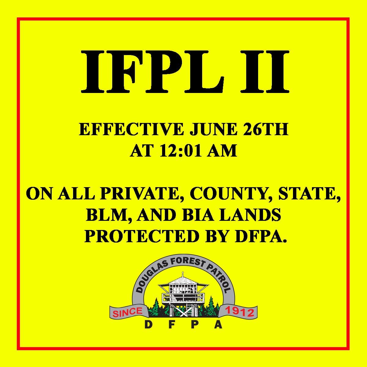The Douglas Forest Protective Association will increase the Industrial Fire Precaution Level to IFPL II (two) on all private, county, state, Bureau of Land Management, and Bureau of Indian Affairs lands that are protected by DFPA. The increase to IFPL II will take effect Saturday, June 26th at 12:01 AM. The IFPL system is a set of fire restriction for industrial operators and other forest workers who are working on forestlands. During IFPL II, the following industrial activities are prohibited between the hours of 1:00 pm and 8:00 pm: • The use of power saws, except at loading sites. • Feller-bunchers with rotary head saws. • Cable Yarding • Blasting • Cutting, grinding, or welding of metal. In addition, a fire watch of at least two hours is required during IFPL II once work has completed for the day. Some private landowners or public land management agencies may require a longer fire watch on the lands they own or manage. For more information about industrial fire restrictions within the Douglas District, visit www.dfpa.net or call 541-672-6507. Via DFPA