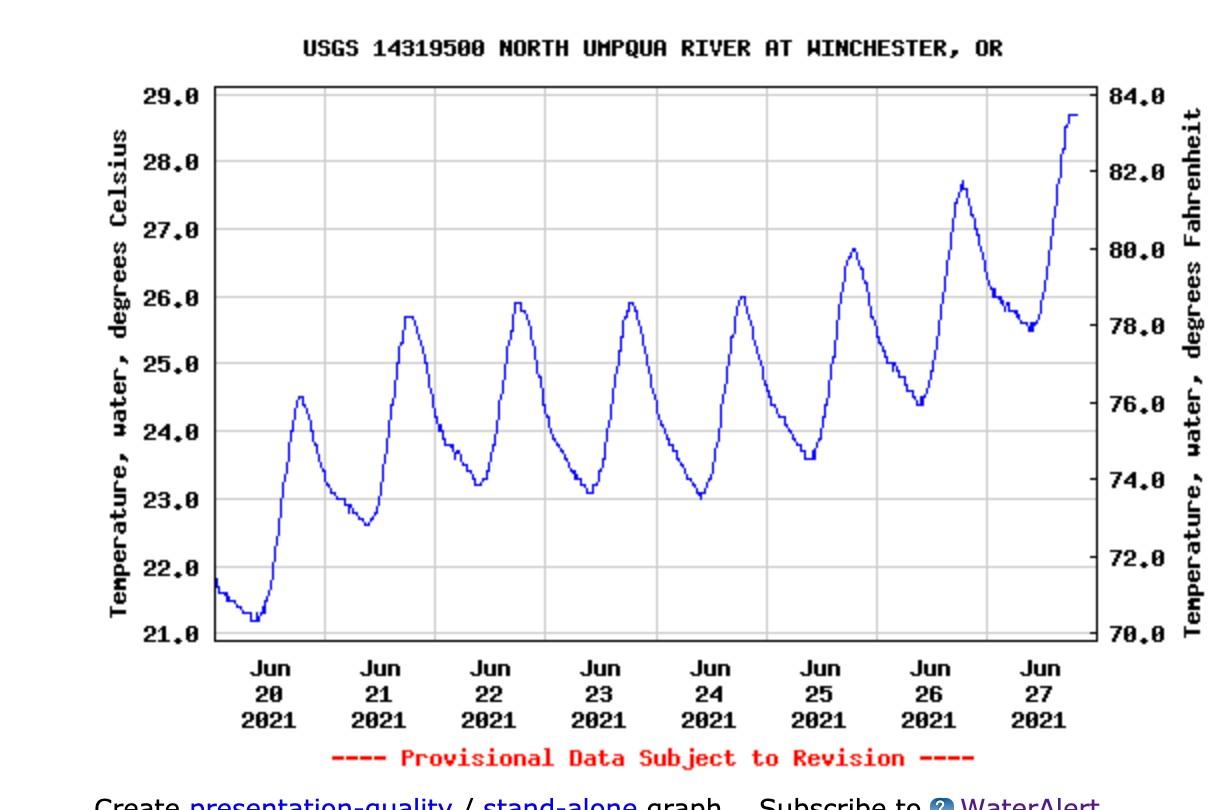 Sunday was the hottest day ever recorded for Roseburg, Oregon at 113 degrees. The previous high temperature record was 109 degrees set on July 20th 1946, and then again on August 15th, 2020. All-time high temperature records were also broken at the following locations across Oregon today: Astoria reached 101 degrees Eugene 111 degrees Hillsboro 109 degrees McMinnville 111 degrees Portland Airport 112 degrees Portland Downtown 110 degrees Salem 113 degrees Troutdale 112 degrees Vancouver 112 degrees Temperatures will cool off a bit in Douglas County starting on Monday with a high expected to be around 97 degrees, then low 90's the rest of the week. The North Umpqua River almost reached 84 degrees today. It should drop back down in the week to come as temperatures at night cool down a bit. For more on the forecast discussion: https://www.wrh.noaa.gov/total_forecast/getprod.php?new&prod=XXXAFDMFR&wfo=mfr