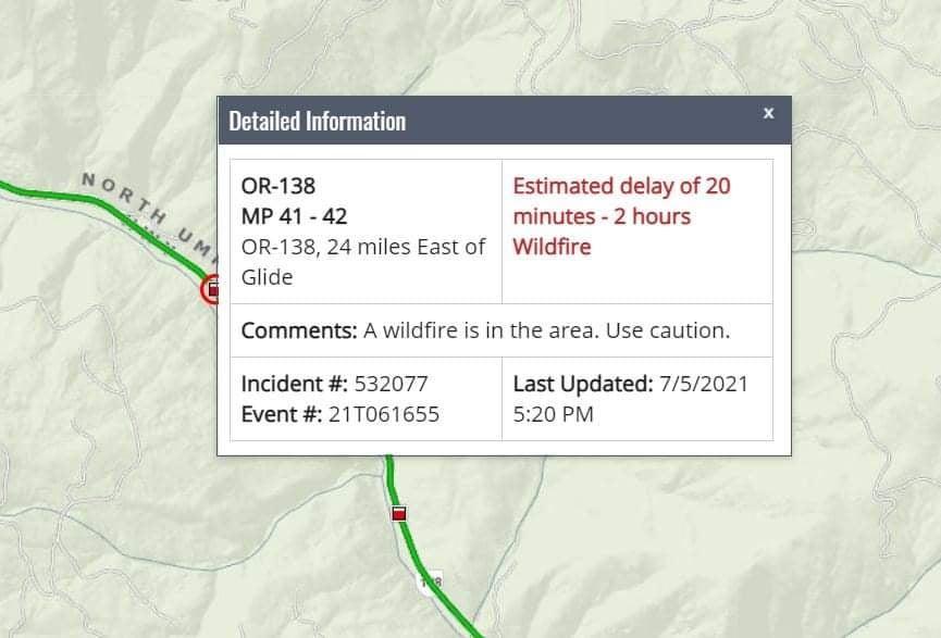A new wildfire started Monday afternoon around 5pm between miles 41-42 about 24 miles east of Glide along Highway 138. Estimates of the fire size are 50-100 acres at this time and it is in rugged terrain. The fire has been named "Jack Fire". Here is the latest release from Umpqua National Forest: "The Umpqua NF has reported a fire west of Diamond Lake. It is reported to be 50 acres and in rugged terrain. Firefighters are on scene and working to fully suppress this fire as quickly and safely as possible. ODOT is en route and Diamond Lake Highway (State Road 138) will be closed until conditions improve. A Type 3 team is inbound with additional capabilities as well as air support. More information will be released as its available." ODOT: SW Oregon: OR 138E, North Umpqua Highway, Due to wildfire, the highway is closed to traffic between MP 40 (Steamboat) and 47 (Dry Creek Store). No estimated time on reopening. Use alternate routes. More information to come Photo by Mikah Gregory