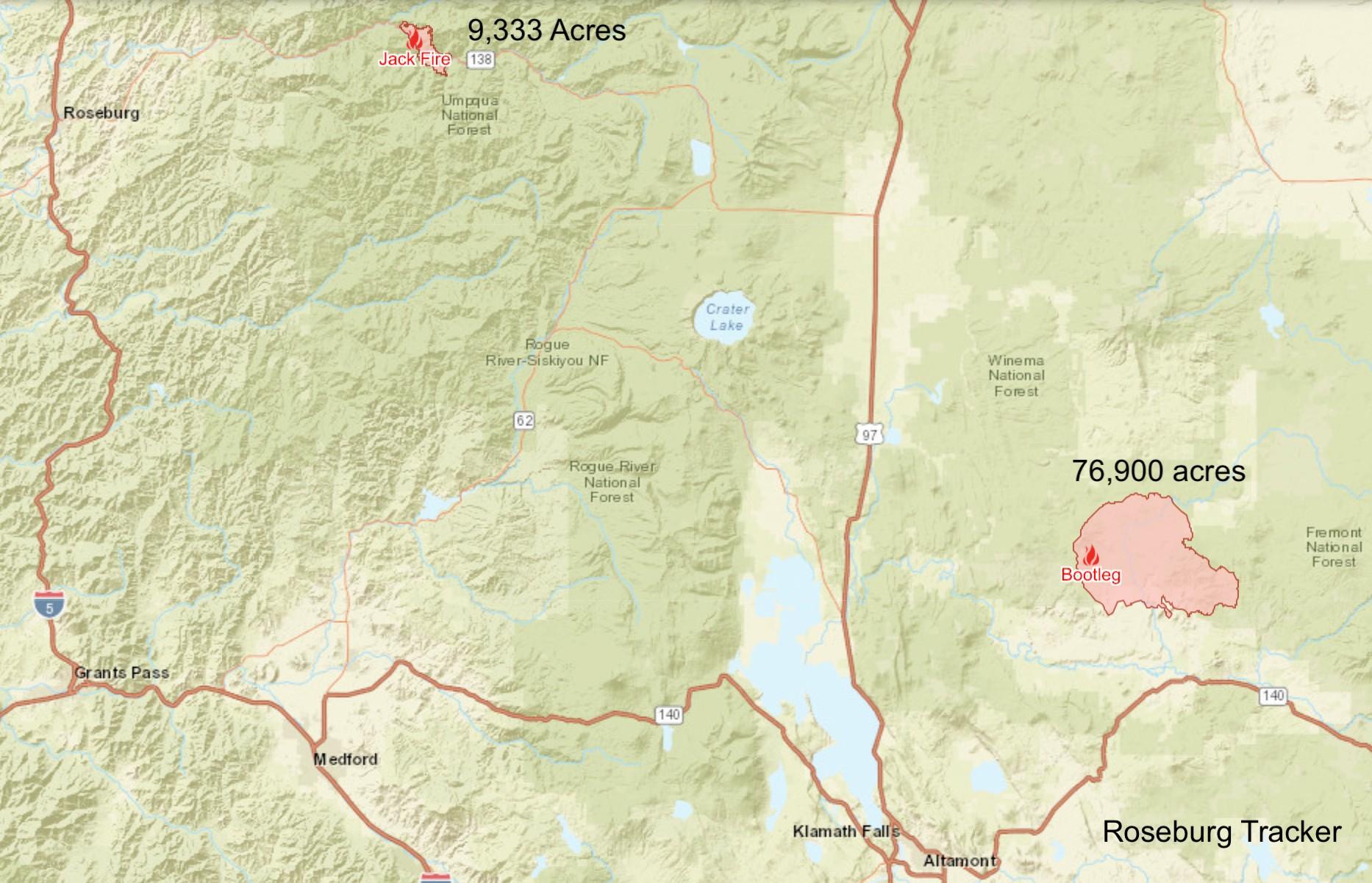 Here is a larger map of the two big fires burning in Oregon right now. The Bootleg Fire has grown to 76,900 acres down in Klamath County as of this morning. That is a monster fire. The Jack Fire burning in the Umpqua district is now at 9,333 acres as of this morning. Smoke looks to be blowing mostly out to the south and east at this time.