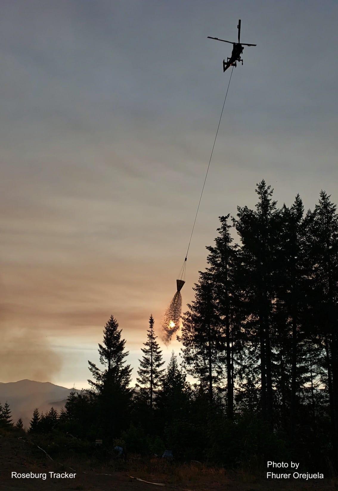 Incredible shot of a helicopter dropping water on the #JackFire last night with the sun setting in the smokey skies. A huge thank you to all the fire crews working so hard on this fire! Photo by Fhurer Orejuela who's been out working this fire with the Forest Service.