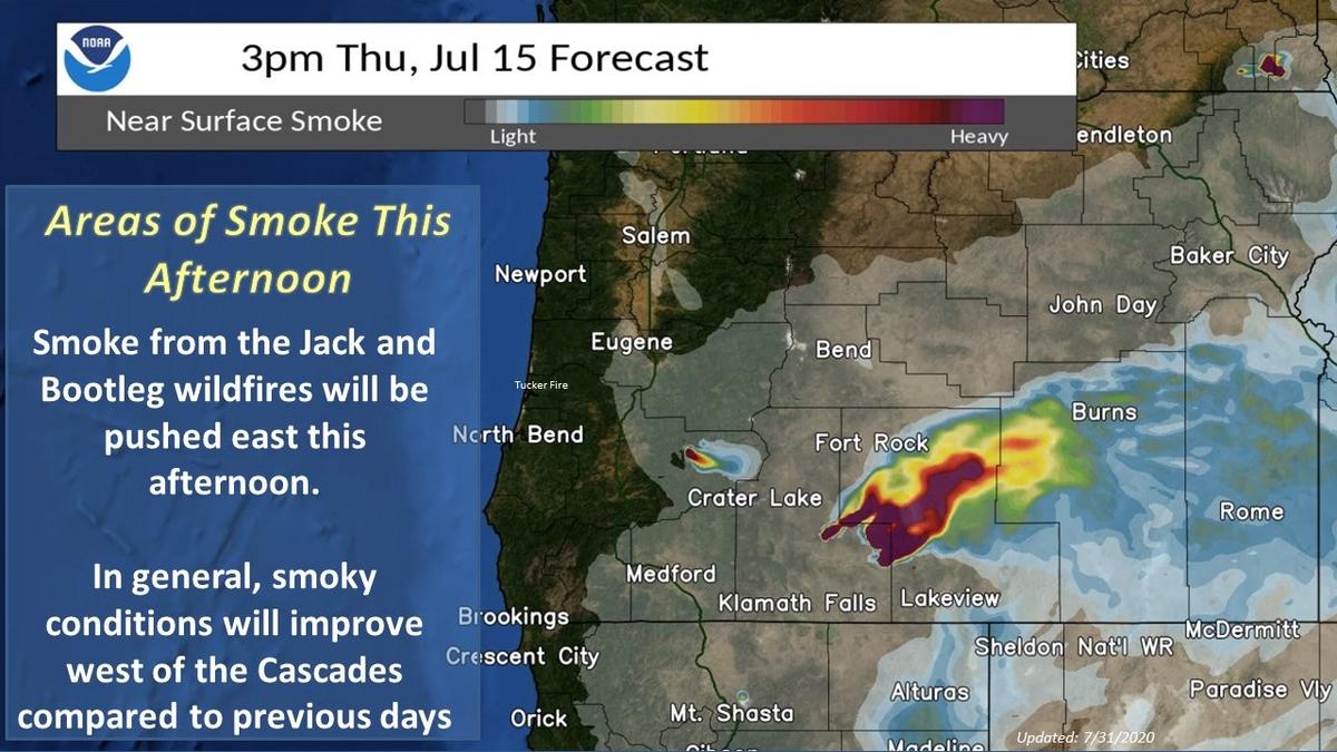 The Jack Fire has grown to 15,248 acres by Thursday morning, July 15th. Yesterday aircraft was unable to fly and gather IR mapping data to determine the fire growth, so this is two day's worth of growth. This is good news as growth continues to slow. Containment on the fire has increased to 20% Thursday morning. Smoke Forecast Smoke from the Jack and Bootleg fires will be pushed east of those sources today, and in general, conditions will improve west of the Cascades compared to previous days. Evacuation Levels Decrease Yesterday the Douglas County Sheriff's Office announced a reduction in the evacuation levels in areas surrounding the Jack Fire. https://www.roseburgtracker.com/posts/60ef860eb45f6a00046485a6 Highway 138 could reopen by this weekend https://www.roseburgtracker.com/posts/60ef7079b45f6a0004648599 Umpqua National Forest has increased it's fire danger level to EXTREME as of today, July 15 https://www.roseburgtracker.com/posts/60ef8329b45f6a00046485a2 Photo of DFPA Squads 1,2,3, and 4, courtesy of Corbin Mandera. Big thank you to all the crews out working the Jack Fire.