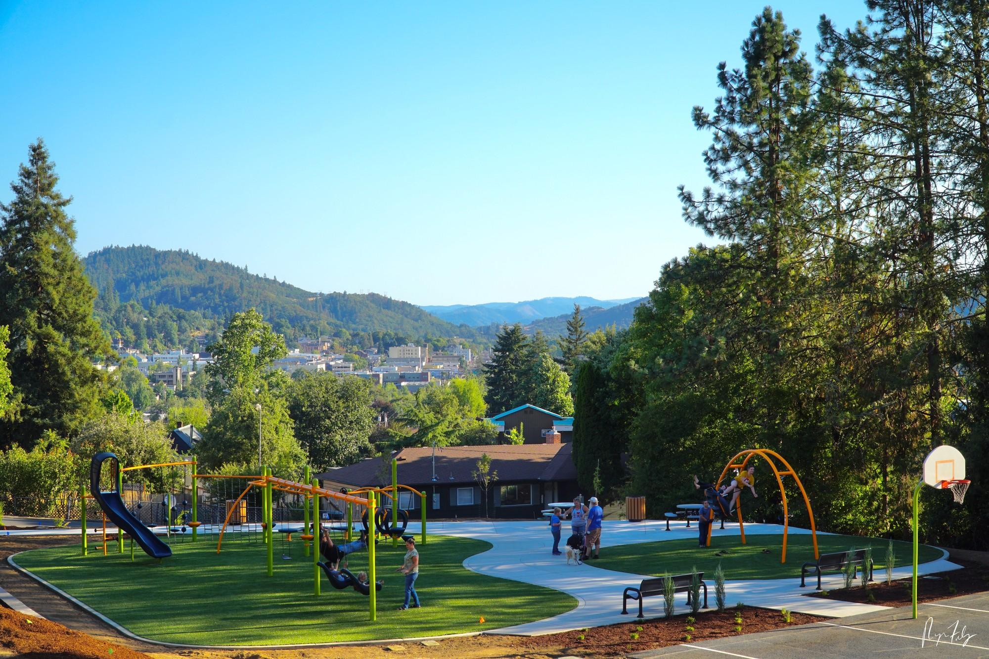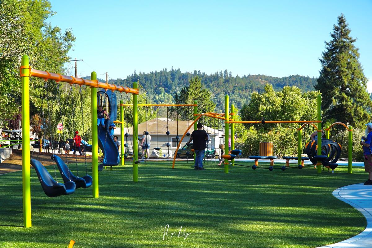 Roseburg residents are invited to celebrate the unveiling of renovated Beulah Park at a grand opening set for Thursday, July 22. A ribbon-cutting ceremony will be held at 9 a.m. Thursday at the 6.85-acre park, which is located in Northeast Roseburg at 1284 N.E. Beulah Ave. between Lincoln and Nash streets. Roseburg Mayor Larry Rich, Public Works Department staff, and city councilors such as Parks and Recreation Commission Chair Alison Eggers will be among those attending. About 20 staff members from the Roseburg Public Works Department collaborated on various stages of the renovation, which began in late February and cost about $260,000. Employees from the department’s divisions of Parks and Recreation, Water, and Streets were led by Engineering Technician Rick Castle, Parks and Recreation Program Manager Kris Ammerman, Design/Construction Manager Ryan Herinckx and Public Works Director Brice Perkins. “We’re really excited to bring this fun, nearly new park to the neighborhood,” Ammerman said. The renovated neighborhood park now has a new Americans with Disabilities Act-accessible playground, a resurfaced basketball court, new ADA-accessible walkways, upgraded site amenities and fresh landscaping. Updated playground equipment in shades of limon green, tangerine orange and denim blue includes a 6.5-foot-tall climbing wall, a free-standing Oodle Swing, O-Zone Climber, Rush Slide, SwiggleKnots and TightRope bridges, Overhead Trekker Ladder, and two Wobble Pod Bouncers. The playground area’s fall zones are protected with ForeverLawn artificial grass layered over safety foam. The basketball court was reduced in size to accommodate the new playground and other amenities, then resurfaced and restriped. However, the court is still a good size, Herinckx said. “We had to shrink the basketball court to get enough real estate up there. It’s not a lot,” he added. Beulah Park sits on a hillside that had to be graded so ADA-accessible walkways could be added from a new ADA parking spot and the sidewalk along the street. The park has gotten new landscaping, benches, two modern picnic tables and a reseeded area for natural grass. A multifunctional water fountain will be added. Beulah is one of the city’s oldest parks, having been in the City’s inventory since the 1960s. Over the years, all of the original playground equipment had to be removed due to non-compliance. The last swing set was removed about five years ago, Herinckx said. This project has been a long time coming, he added. About $158,000 for the renovation came from an Oregon Parks and Recreation Department grant. City funds and labor covered the rest of the cost. For more information, call the Public Works Department at 541-492-6730 or email pwd@cityofroseburg.org. Via City of Roseburg