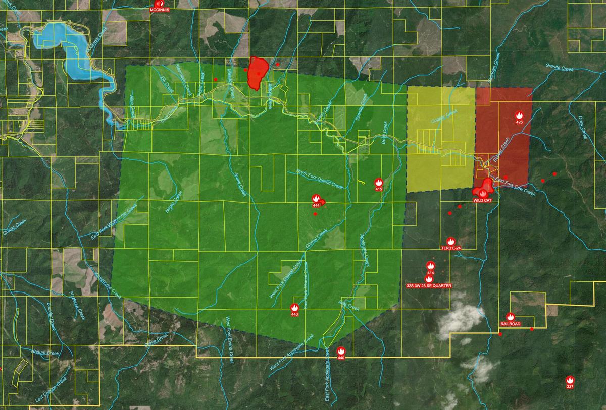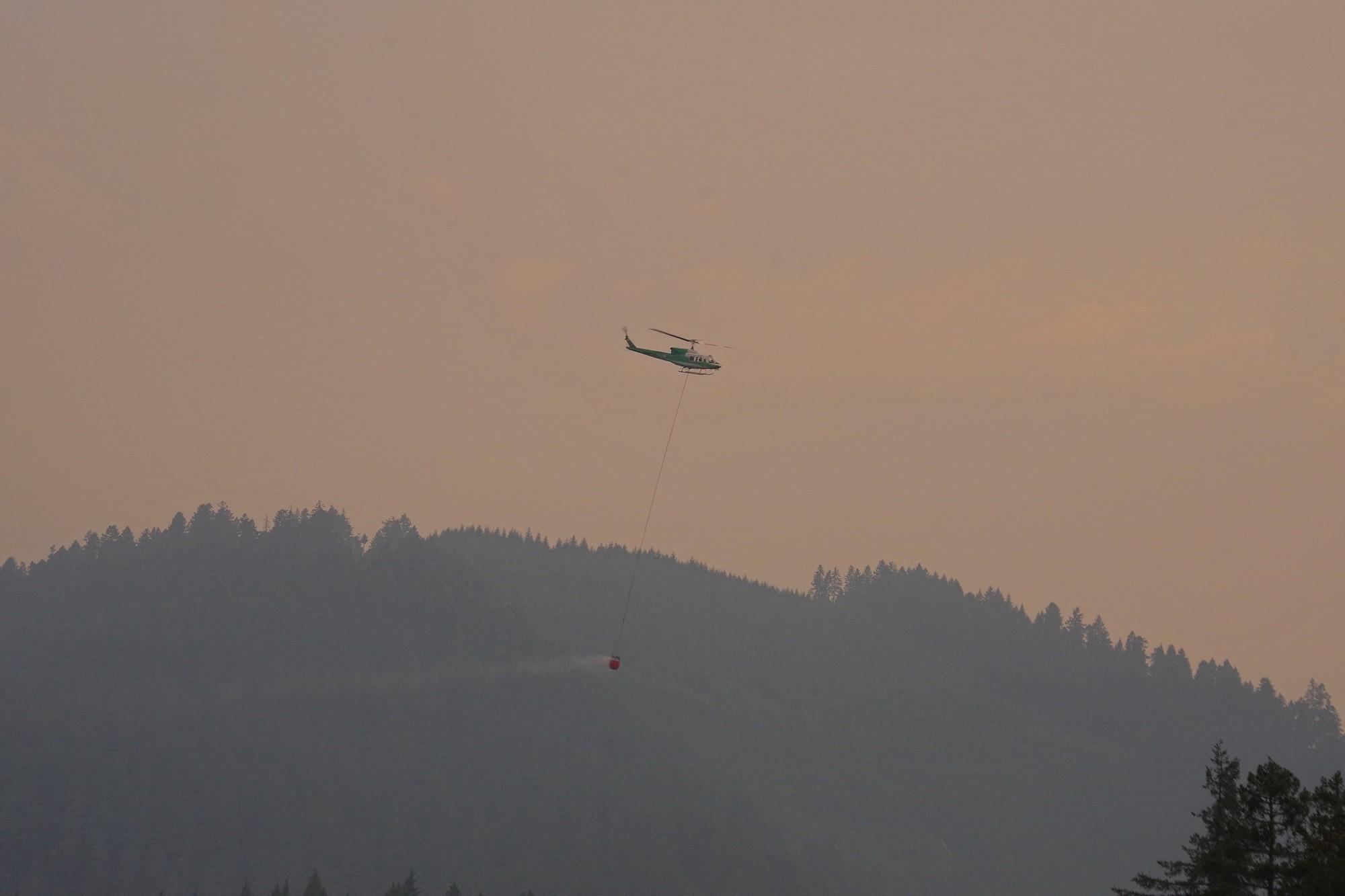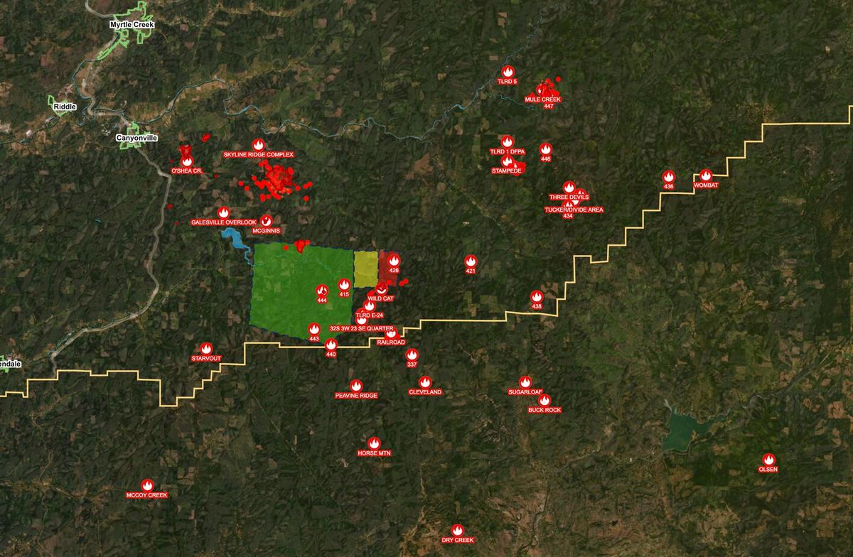 Smoke from fires burning in northern California dampened fire activity on the Skyline Ridge Complex today. The complex is comprised of 24 fires burning on public and private lands east of Canyonville. The smoky conditions allowed firefighters to make progress corralling the blazes. The fires showed occasional activity, making short runs but overall growth was limited. An infrared flight last night mapped the complex at 981 acres. Containment is estimated at 0%. On the Poole Creek Fire, crews with heavy equipment began opening roads in preparation for a sustained suppression effort. In the Upper Cow Creek area, firefighters completed a containment line around the Ike Butte Fire and laid hoses to support mop-up operations. Crews had a successful day on the Galesville Fire, securing the fire line and installing hose lays. Firefighters were also engaged on O’Shea Creek, Packard Creek, Hill Creek and Sweat Creek Fires. The fire area remains under a Red Flag Warning due to low humidity and unstable conditions. The forecast calls for increasing humidity, which will also moderate fire behavior in finer fuels. Larger fuels, such as downed trees, will continue to burn, especially on ridge tops. Smoke accumulations in the lower drainages could pose driving hazards for firefighters and the public. Crews on night shift plan to take advantage of smoky conditions and higher humidity to engage several small fires directly. The focus will be on the O’Shea Creek, Beale Creek and Turkey Creek Fires with the aim to hold and improve the fire’s perimeter control lines. Via Incident Command