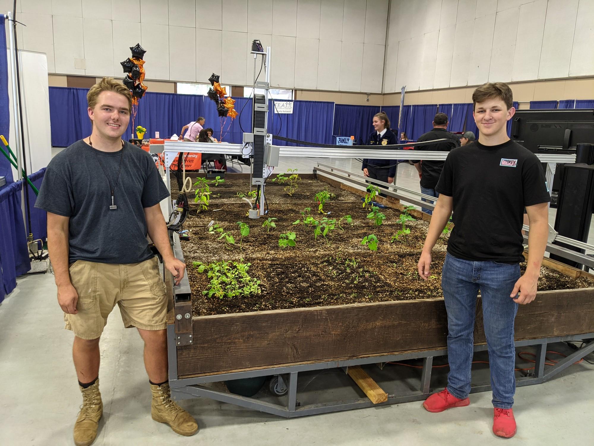 If you are out at the Douglas County Fair make sure you stop by Douglas Hall and check out this amazing project by some students from Sutherlin's FFA! They built an amazing robotic farming tool that can plant seeds, water the plants, weed the beds, and can check soil moisture levels. Daniel Lyons, (left), was part of the original team and has been helping hand off the project to Anthony Clark (right) and Erin Eslinger. Their instructor is Mr. Crawford.
