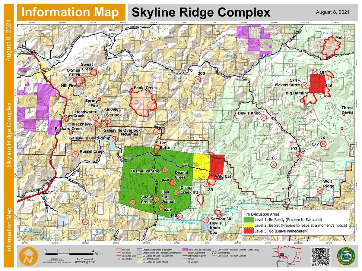 With a dozen smaller wildfires mostly trailed, mopped up or already in patrol status, more firefighters are engaged on preventing the spread of the Poole Creek Fire. Containment on the Complex has risen to 9 percent. At 1,942 acres, Poole Creek is the largest fire in the Skyline Ridge Complex. It is burning roughly six miles southeast of the community of Days Creek. Firefighters plan to keep the fire within two steep drainages by building control lines on ridgetops and securing them with controlled burns at night. This will protect houses and outbuildings on the south bank of the South Umpqua River. Local residents can expect to see more fire traffic and smoke from burn-out operations. Fire managers at the Complex are also responsible for identifying and helping suppress new fires in the area. Sunday afternoon they did just that. A pilot assigned to the Complex spotted a fire on the border of Douglas and Jackson counties, fire managers sent a 10-person hand crew to help Douglas Forest Protective Association firefighters engage the fire. The fire was kept to less than an acre. It likely started during last week’s heavy lightning strikes. ODF Team 1 is hosting a virtual community meeting on Facebook Live Sunday at 7:30 p.m. You can find the event at https://www.facebook.com/events/540312997032963. Incident Commander Joe Hessel said, “We’re protecting multiple values at risk including homes, communities, commercial timberlands, powerlines, recreation and cultural sites, and treasured fishing and hunting grounds. It drives our work to secure the last three active fires in the Complex as fast and as safely as we can.” Community Meeting: An in-person community meeting will be held this evening at 7:30 PM at the Tiller Volunteer Fire Department. Fire managers from both Devil’s Knob and Skyline Ridge Complexes will provide operational fire updates and an opportunity for the public to ask questions. We are asking the public to bring and wear a mask as a COVID-19 mitigation and be prepared for warm weather conditions as the meeting will be outside. Updates and photos via IC