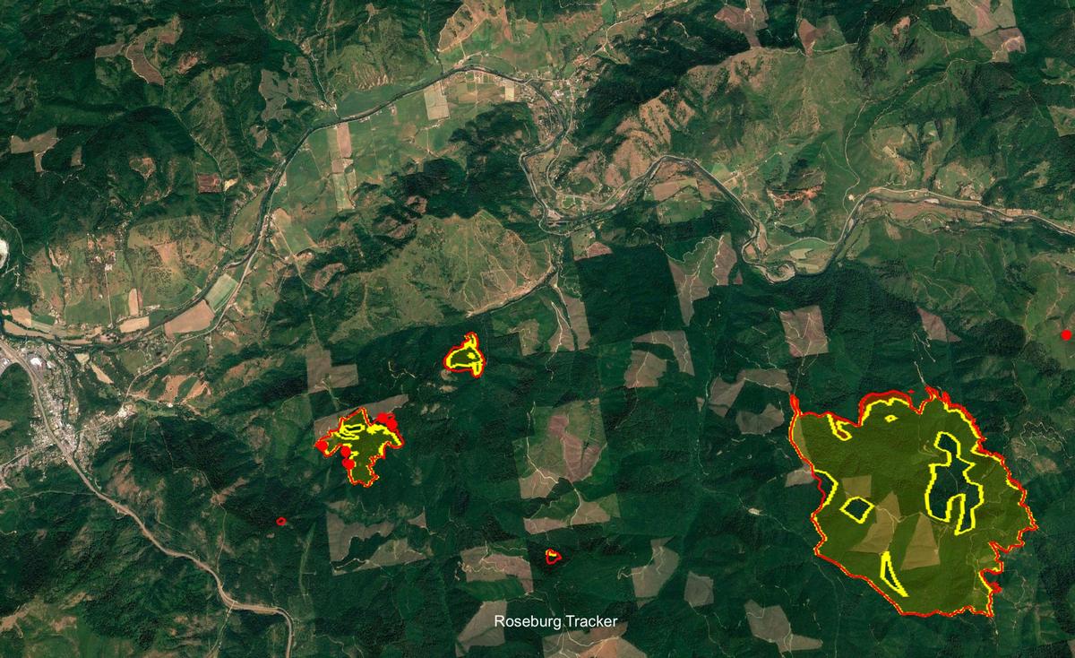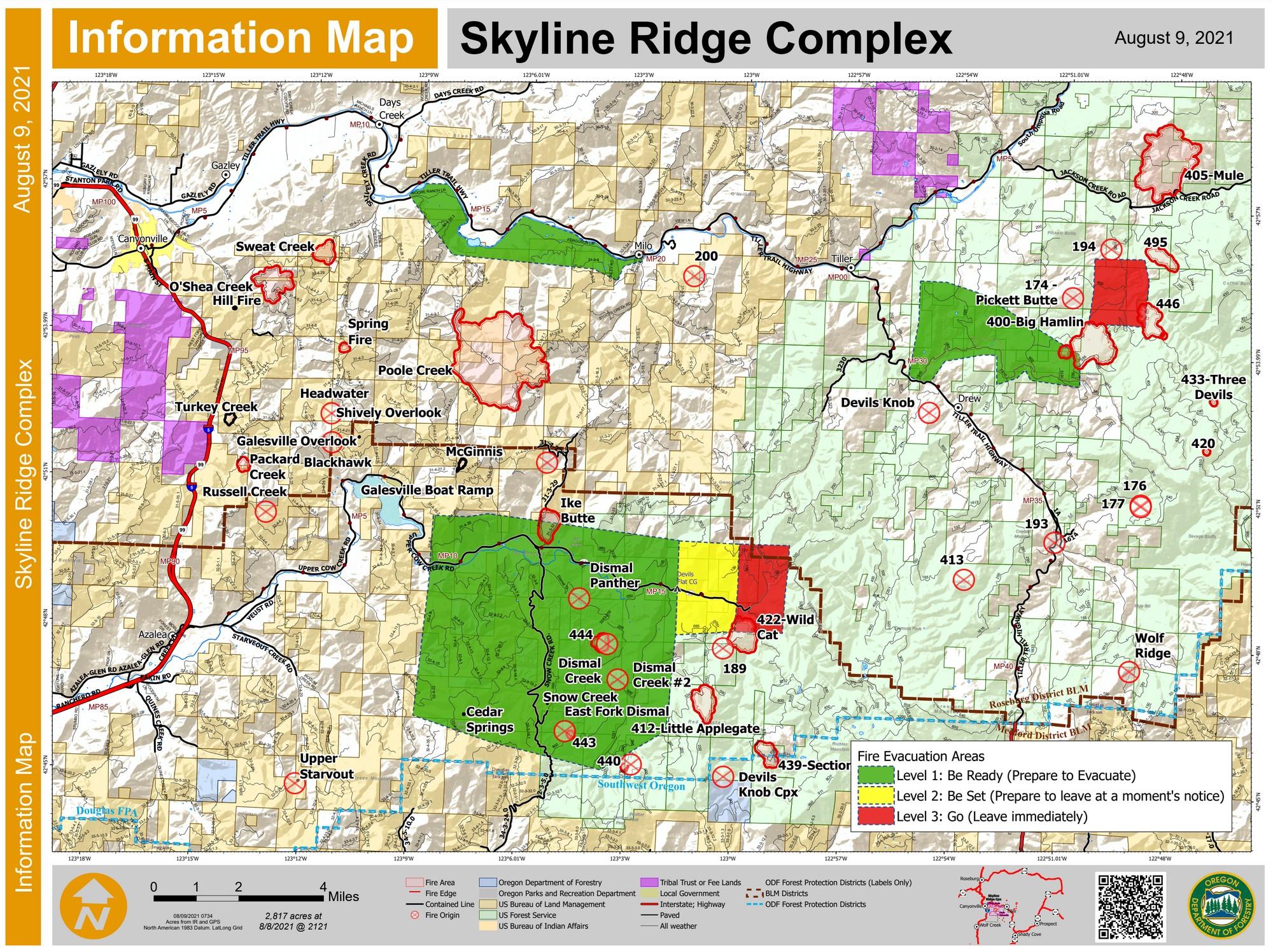 Of the 19 fires comprising the Complex, 18 did not grow over the past couple of days, boosting overall containment to 14%. Objectives today continue with mop-up, patrol and reinforcing control line on all fires while directing more resources to contain the 2,350-acre Poole Creek Fire. Roughly six miles southeast of the community of Days Creek, the Poole Creek Fire is a top priority for firefighters. Additional crews are helping to strengthen containment lines. Helicopters are dropping water and retardant to slow the fire’s growth. Burn-out operations continue today, which will strengthen and deepen containment lines. This will allow firefighters to safely engage the fire while protecting houses and outbuildings on the south bank of the South Umpqua River. Local residents can expect to see more fire traffic and smoke from burn-out operations. Air operations personnel have set up a mobile retardant base. The retardant base will help facilitate quick retardant drops to reinforce control lines in front of the burnout operations. As a precaution, the Douglas County Sheriff's Office has issued a Green or Level 1 “Be Ready” evacuation advisory for residences in the area north of Poole Creek Fire. This includes an area south of the South Umpqua River along Tiller Trail Highway including all addresses on Ferguson Lane and Moore Ranch Road. www.dcso.com/evacuations. ODF Team 1 hosted a virtual community meeting on Facebook Live yesterday evening. For more information on the fires, you can watch the recorded event at: https://www.facebook.com/skylineridgecomplex/videos/197339652288528 Here is the latest fire boundary and informational maps for the Skyline Ridge Complex for Monday August 9th.