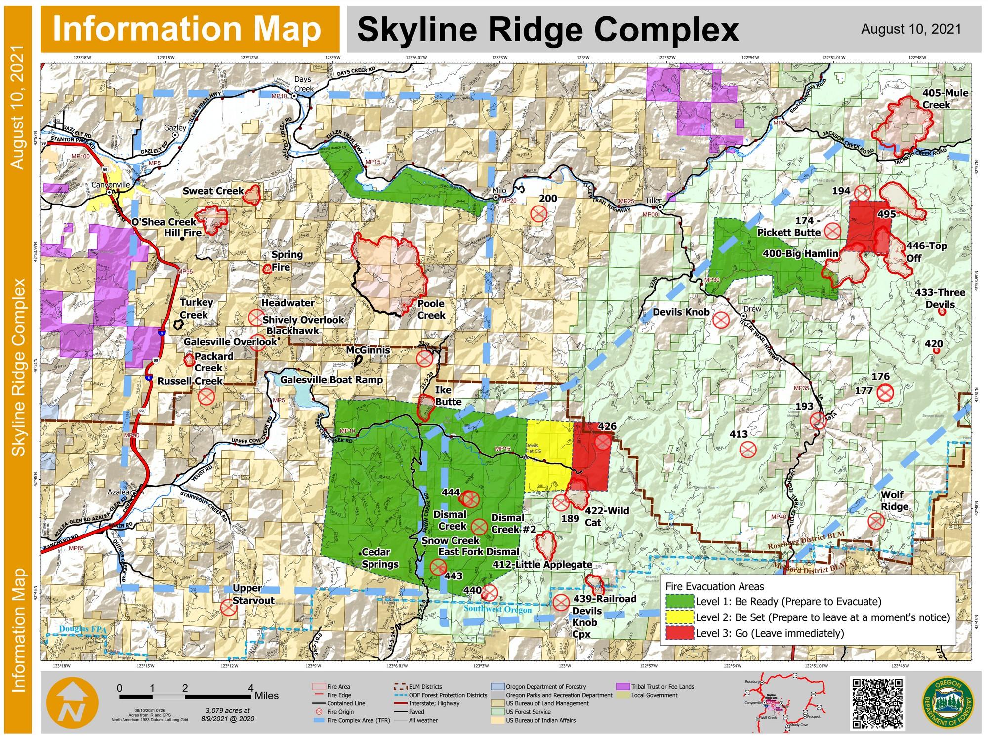 With an excessive heat warning starting today and expected to last through Saturday, the Poole Creek Fire is expected to become more active. The National Weather Service has issued a red flag warning due to unstable conditions and excessive heat. Yesterday evening the Poole Creek Fire crossed the containment line on the east side. Firefighters quickly responded and will continue working to corral the 100-acre spot fire today. A strong control line has been built on the northwest side of the fire to protect homes on the south side of the South Umpqua River. Two Oregon State Fire Marshal taskforces will arrive on the fire this evening to provide additional support around structures if needed. Crews continue to patrol and mop-up the smaller fires within the complex. Crews with hand-held infrared cameras identified and marked hot spots within the Sweat Creek Fire about 3.5 miles east of Canyonville. The spots were flagged and will be extinguished today. As the smaller fires gain more containment, crews are being sent to support the Pool Creek Fire. As a precaution, the Douglas County Sheriff's Office has issued a Green or Level 1 “Be Ready” evacuation advisory for residences in the area north of Poole Creek Fire. This includes an area south of the South Umpqua River along Tiller Trail Highway including all addresses on Ferguson Lane and Moore Ranch Road. www.dcso.com/evacuations Latest Skyline Ridge Complex Information: Estimated Size: 3,079 Acres Containment 21% Location 5 Miles SE of Canyonville, OR Cause: Lightning Personnel: 1,203 Hand Crews: 39 Engines: 37 Dozers: 12 Water Tenders: 21 Other heavy equipment: 19 Assigned Aircraft: 12 Structures threatened: 100 Via Incident Command