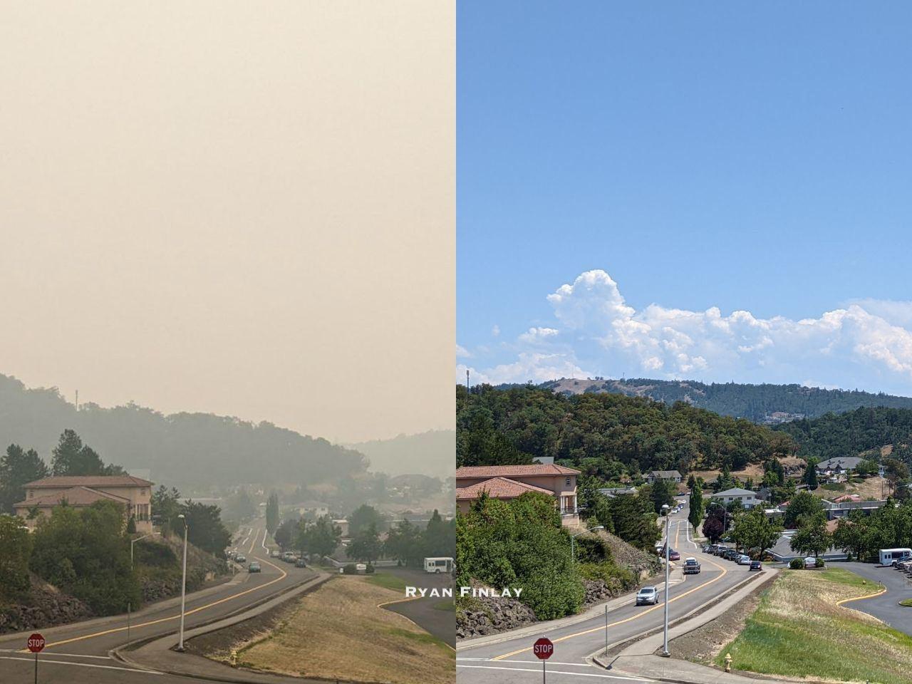 This is what Roseburg looks like today versus a normal day. Pretty amazing how much smoke is in the air. Things should start to get better this weekend.