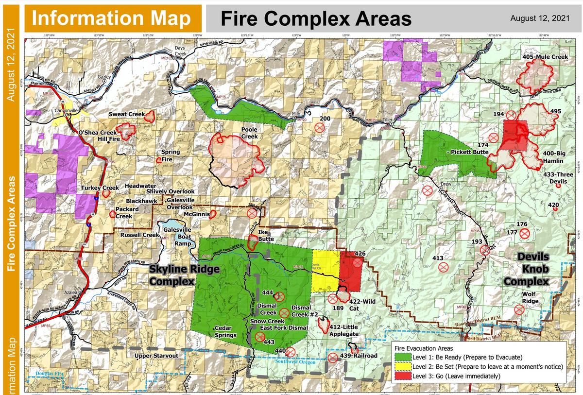 Here is the latest update for the wildfires in Douglas County as of Thursday morning August 12th. Skyline Ridge Complex - 3,640 Acres, 23% contained Devil's Knob Complex - 5,793 Acres, 5% contained Jack Fire - 23,386 Acres, 53% contained Rough Patch Complex - 4,765 Acres, 3% contained ***Skyline Ridge Complex Morning Update, Aug. 12, 2021*** A new control line has been built from the east ridge flanking the Poole Creek Fire, tying it to Stouts Creek Road. The new line corrals a large spot fire that firefighters battled earlier in the week. It connects to the main northern control line. The goal is to keep the fire boxed in between the two main ridges, with active suppression of any new fire starts beyond control lines. Crews mopped up after last night’s planned burn-out operations. They also mopped up a quarter-acre spot fire on the fire’s east flank. Overall containment on the Complex remains at 23 percent. Acreage increases on the Complex come from growth on the Poole Creek Fire, now at 3,640 acres. The number of personnel has reached 1,280. Thick smoke yesterday grounded most air operations, but moderated temperatures and fire behavior. Smoke will linger today. There is a Red Flag Warning for hot, dry and unstable conditions but winds will be light. Structural firefighters with the Oregon Office of the State Fire Marshal completed an initial assessment of properties along Ferguson Lane near the northern control line for Poole Creek. They will be present as a precaution while the fire backs down two drainages toward an established fire line on the fire’s north side. Three reportable injuries on the fire occurred yesterday when a night shift crew returning from the line drove off Tiller Trail Highway. The firefighters suffered minor injuries. ***Devil's Knob Complex Morning Update, Aug. 12, 2021*** Complex Total Acreage: 5,793 Complex Total Containment: 5% General Updates: Significant progress was made on mopping up of small fires, and portions of larger fires, as well as containment actions on larger fires within the Complex. Eight smaller fires within the Complex are considered either controlled or out. The priority continues to be taking suppression actions on larger fires that are on or near private property and homes. As high priority fires become contained and mopped up in the southern portion of the Complex, resources will be moved to the central and northern portions of the Complex to other priority fires. Fire behavior will continue to be very active due to high temperatures, low humidity, and low fuel moisture. Firefighters will continue to be very vigilant watching for spot fires and other extreme fire behavior. The following is a brief summary of the significant fire activity over the fire complex starting from north to south: Smith Fire – 758 acres - growth continues to be minimal, the fire is holding on the Dumont Creek Road. Approximately two miles of road containment line has been prepared with a focus on preventing fire spread to the north and west. Mule Creek Fire – 989 acres – the fire is staying within established contingency lines, mop up operations continue to make good progress. Big Hamlin Fire – 3,562 acres – the Top Off (446) Fire, the 495 Fire, and the Big Hamlin Fire have burned together. These three fires have been combined into what is now referred to as the Big Hamlin Fire. The southwest flank of the fire is holding within containment lines. Containment efforts are focused on preventing the fire's easterly movement where it has been spotting out in front of the main body of the fire toward and into an older fire scar area known as the Whiskey Fire (2013). Efforts include opening up old firelines that were constructed for the Whiskey Fire to use as contingency lines should the fire continue to push easterly. Little Applegate Fire – 135 acres – currently holding in the existing footprint, containment line is nearing completion. Hotshot crews have constructed a check line below a cliff rock band on Red Mountain. Wildcat Fire – 215 acres – stayed within the same footprint; containment line has been constructed on the west side to the private land on the north and mop up operations will continue. Containment efforts are focused on the south and east flanks to hold the fire. To limit firefighter exposure to hazardous trees (snags), a sprinkler system has been installed to check the fire along the South Fork of Cow Creek. Construction of contingency line will continue in the area of South Fork Cow Creek and Forest Service Road 090 in case the fire moves out of the current footprint. Section 30 (Railroad) Fire – 75 acres – significant mop up progress has achieved 100 – 200 feet into the interior of the fire. The unnamed, smaller fires make up the remaining acres and continue to be mopped up and monitored. Fire patrol checks were completed on numerous controlled and contained fires. The firefighting resources on the Devil's Knob Complex are also responsible for conducting initial attack operations on the entire Tiller Ranger District, including private land holdings. Weather: Today will be mostly sunny with smoke. Temperatures are predicted to continue to trend upwards into the mid-90s to low 100s through Saturday. A Red Flag Warning will be in effect this afternoon. An Excessive Heat Warning has been posted and will extend through Saturday for all of southwest Oregon. Winds will be from the north-northwest at 5-10 mph with gusts up to 20 mph. Relative humidity will range between 13 – 18 percent. Air Quality: Smoke levels can change rapidly depending on weather. Check current conditions on the Oregon Smoke Information Blog: http://oregonsmoke.blogspot.com/. Resources: 3-type 1 hotshot crews, 2-type 2 IA crews, 12-type 2 crews, 3-camp crews, 40-engines, 19-dozers, 17-water tenders, 154-overhead, 3-masticator, 1-heavy lift helicopter, total resources – 685. Evacuations: On August 8, Douglas County Sheriff's Office issued a Level 1 “