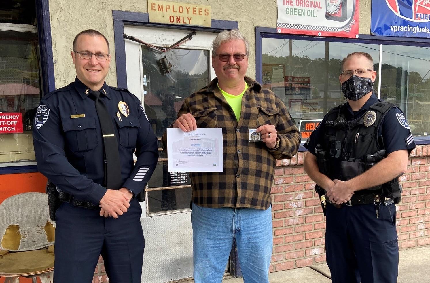 On February 22, 2021 at 2:56 pm, Roseburg Police Officers responded to a report of a shooting at the Budget 16 Motel, at 1067 NE Stephens. Off duty Patrol Sergeant Doug Walton was across the street at the OK’s Auto Supply gas station getting fuel for his personal vehicle. Upon witnessing the shooting, Sgt. Walton immediately called to report the incident. Sgt. Walton remained on the phone and provided updated information that was shared with responding Law Enforcement. The investigation later revealed Spring Mack and Jessica Ashley both sustained serious gunshot injuries. Michael Benson was pronounced deceased at the scene and it was determined he succumbed to a gunshot wound. Sgt. Walton observed Devin McNamara fleeing the motel parking lot, armed with a handgun but seemingly out of ammunition. Sgt. Walton observed McNamara flee to a nearby residence and then return, armed with two rifles that he pointed at passing motor vehicles. McNamara then entered Sgt. Walton’s pickup and another vehicle at the gas station. Sgt. Walton continued to provide Douglas County Emergency Communications with updated information. After exiting the second vehicle, McNamara was no longer in possession of the rifles. McNamara made his way to the fuel pumps where he grabbed a pump nozzle and began to release gasoline. Fortunately, an employee at OK’s Auto Supply, Tony MacDonald, recognized what McNamara was doing and shut off the emergency fuel switch. When the opportunity presented itself, Sgt. Walton tackled McNamara to the ground and kept him physically restrained until Patrol Officers arrived and took him into custody. Throughout this chaotic event, Sgt. Walton exercised excellent judgement and decision-making. Sgt. Walton was the first to report the incident to on-duty police, and he did so while communicating to those around him what was happening and helping them remain safe. He followed department procedure and remained a “professional witness” until he recognized an opportunity to bravely detain McNamara. “Sgt. Walton’s actions during this incident were heroic, and very likely saved lives; his selfless actions showed outstanding and exemplary courage to uphold the very oath he swore upon, to protect and serve others,” said Chief Klopfenstein. Chief Klopfenstein additionally met with Tony MacDonald and presented him with a Letter of Gratitude and a department challenge coin for his actions. Via Roseburg Police Department