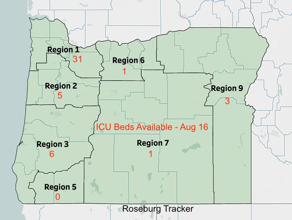 There are now 752 Oregonians hospitalized due to the coronavirus, health officials said on Monday. This is worse than any other time in the pandemic, even before vaccines were available. In the latest numbers released today, Region 5, which is made up of Jackson and Josephine counties now has zero available ICU beds. As of Monday August 16 at noon, there are now 56 Douglas County residents hospitalized, 50 locally at CHI Mercy hospital in Roseburg. To keep up on the stated available hospital beds in each region across the state: https://public.tableau.com/app/profile/oregon.health.authority.covid.19/viz/OregonCOVID-19HospitalCapacity/BedAvailabilitybyRegion