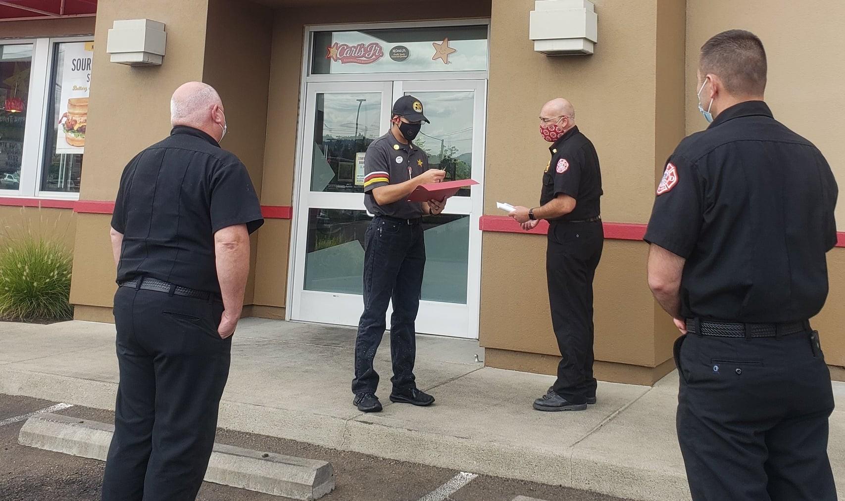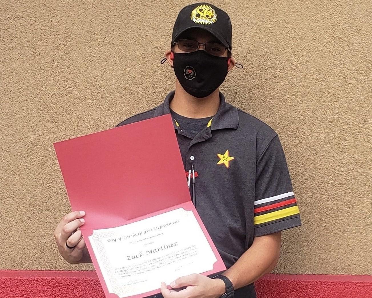 On August 6, 2021, at about 12:55 a.m., a fire started on the exterior of the Rodeo Steakhouse on Garden Valley Blvd. Zack Martinez, working his shift at the nearby Carl’s Jr. restaurant, was taking out garbage after closing up. Zack saw the fire starting on the outer wall of the Rodeo Steakhouse and immediately called 911, directing responding firefighters to the scene and making sure they had all the information they needed to suppress the fire before it did serious damage to the building. Today, members of the Roseburg Fire Department met with Zack and presented him with a Certificate of Appreciation and an official Roseburg Fire Department Challenge Coin. Fire Chief Monte Bryan personally thanked Zack for his quick thinking and his service to the community. “If Zack had not seen the small fire and called 911 when he did,” said Chief Bryan, “the Rodeo Steakhouse would most likely have suffered significant damage before our firefighters were alerted and responded. We are grateful for Zack and folks like him who step up and help our first responders in times of need.” Via Roseburg Fire Department