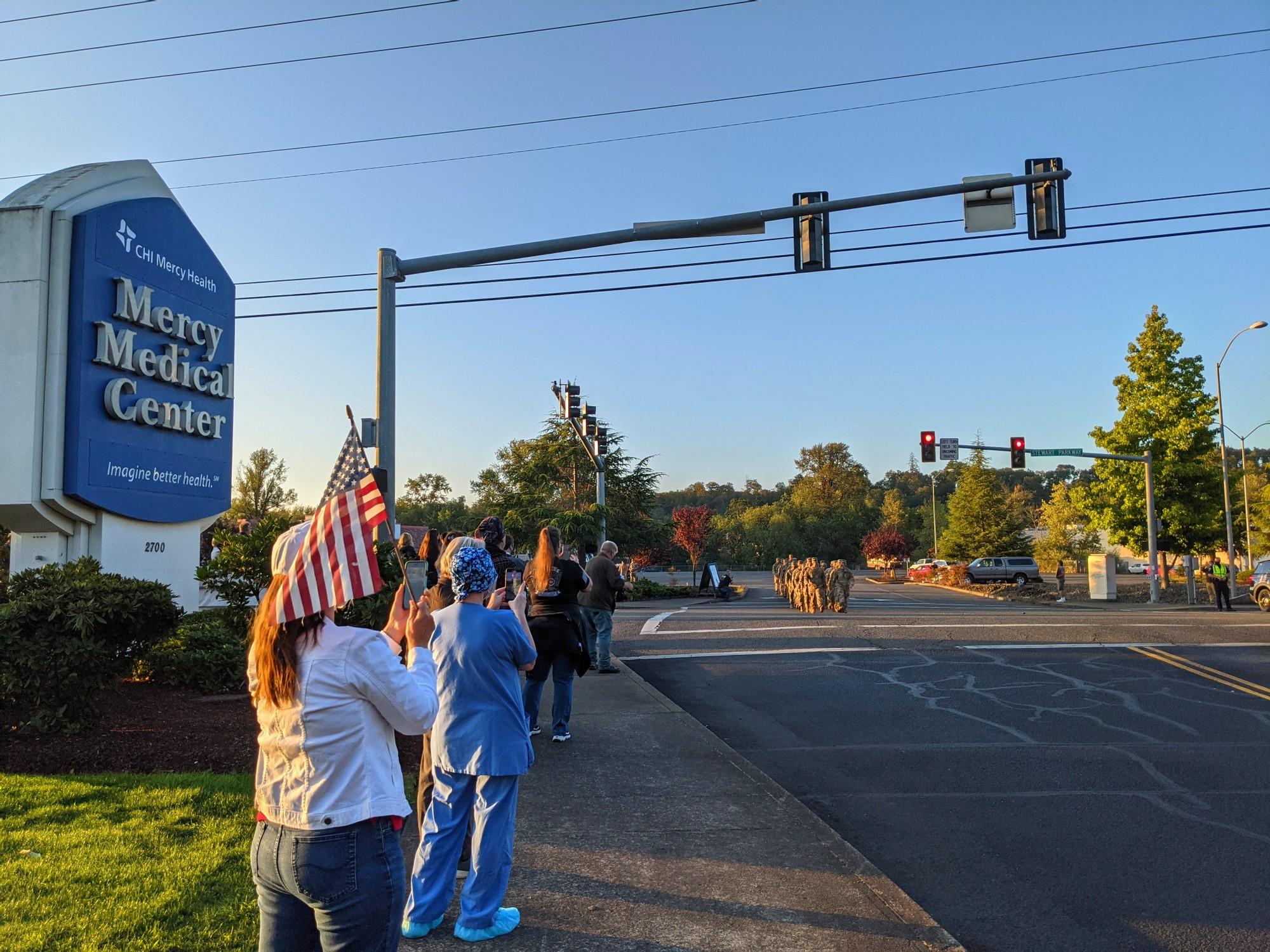 Beautiful morning welcoming our National Guard to CHI Mercy Hospital! Hospital staff and community members lined the road into the hospital to honor and thank the Guard members for their help during this challenging time. ❤️ Also thank you to Roseburg Police for escorting the Guard members onto the property and assisting with traffic control.