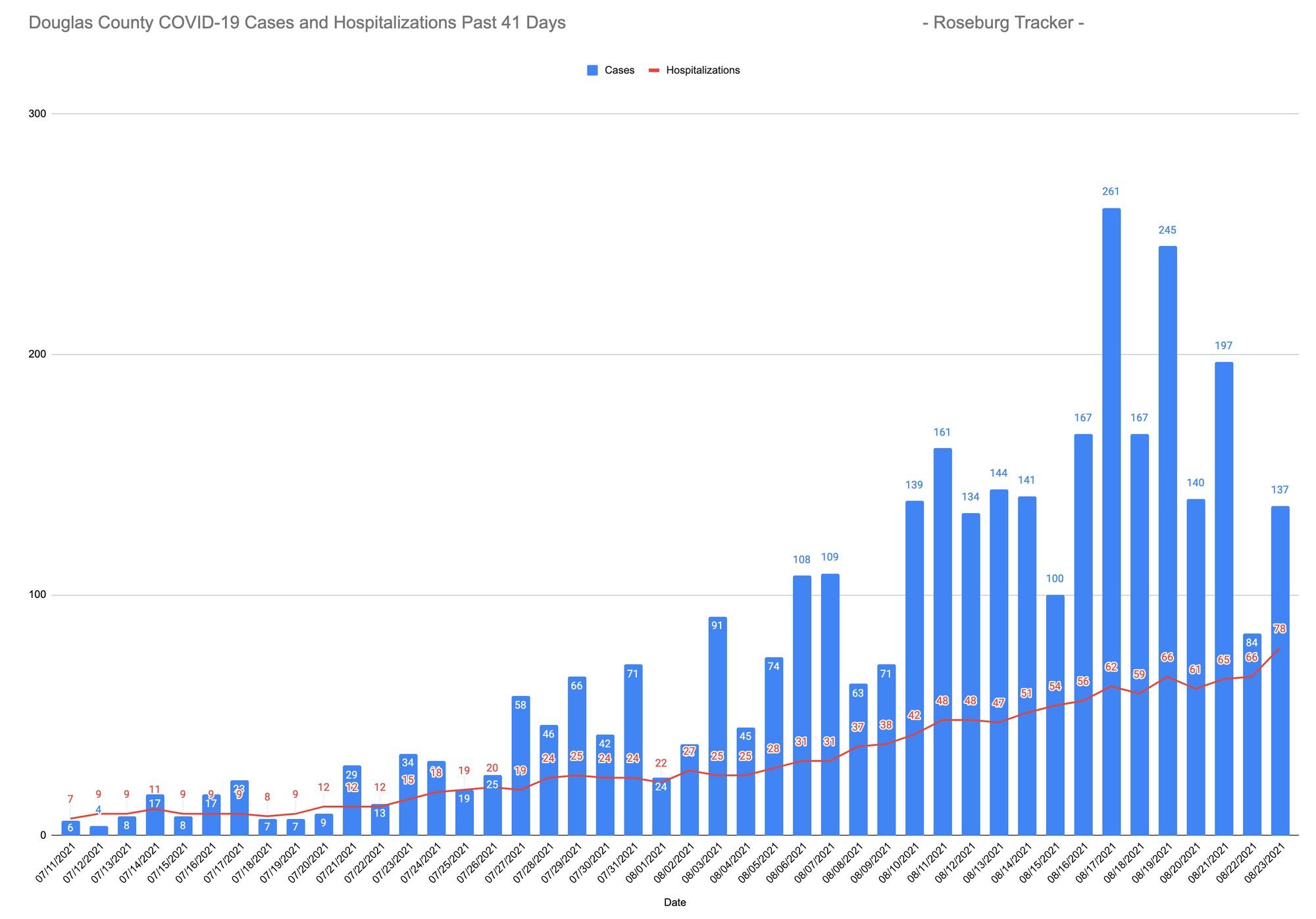 Douglas County has the highest cases/100k residents of any county in Oregon over the past 7 days, and it's not even close. The county has 1,125 cases/100k residents, with the next closest county in Oregon being Josephine County at 916 cases/100k residents. Franklin County in Washington is the only county higher than Douglas County, at 1,137 cases/100k. Nowhere in California is even close to these high case saturations. COVID-19 WEEKEND RECAP FOR SATURDAY, AUGUST 21, 2021: On Saturday, August 21, 2021, at 12:00 pm we had ONE HUNDRED AND NINETY-SEVEN (197) people with new positive test results and THREE (3) new deaths to report bringing our total number of cases of people with positive test results and presumptives in Douglas County to 7,216*. We had SIXTY-FIVE (65)Douglas County COVID-19 patients hospitalized, fifty-six locally and nine out-of-the-area, including two patients that have been transferred out of the state for specialized care not available here. We continue to work with Mercy to provide information on our COVID patients being hospitalized locally: 16 ventilators (invasive mechanical airway support) are currently in use, and 14 COVID positive patients are in the Intensive Care Unit (ICU). COVID-19 WEEKEND RECAP FOR SUNDAY, AUGUST 22, 2021: On Sunday, August 22, 2021, at 12:00 pm we had EIGHTY-THREE (83) people with new positive test results and ONE (1) presumptive that has been moved to positive with a positive test result to report bringing our total number of cases of people with positive test results and presumptives in Douglas County to 7,299*. We had SIXTY-SIX (66) Douglas County COVID-19 patients hospitalized, fifty-seven locally and nine out-of-the-area, including two patients that have been transferred out of the state for specialized care not available here. We continue to work with Mercy to provide information on our COVID patients being hospitalized locally: 14 ventilators (invasive mechanical airway support) are currently in use, and 11 COVID positive patients are in the Intensive Care Unit (ICU). COVID-19 WEEKEND RECAP FOR MONDAY, AUGUST 23, 2021: As of 12:00 pm today, Monday, August 23, 2021, there are ONE HUNDRED AND THIRTY-SIX (136) people with new positive test results, ONE (1) new presumptive and THREE (3) new death to report, bringing the total number of cases of people with positive test results and presumptives in Douglas County to 7,436*. Currently, there are SEVENTY-EIGHT (78) Douglas County COVID-19 patients that are being hospitalized, sixty-five locally and thirteen out-of-the-area, including two that have been transferred out of the state for specialized care not available here. We continue to work with Mercy to provide information on our COVID patients being hospitalized locally: 12 ventilators (invasive mechanical airway support) are currently in use, and 12 COVID positive patients are in the Intensive Care Unit (ICU). Of our hospitalized cases today, SIXTY-NINE (69) out of the 78 were not vaccinated. COVID-19 RELATED DEATHS OF DOUGLAS COUNTY RESIDENTS Our Douglas County Public Health Officer, Dr. Robert Dannenhoffer, has confirmed the deaths of five more Douglas County residents related to the COVID-19 virus. Our one hundred and eleventh COVID-19 related death was a 69-year-old woman who was diagnosed with COVID-19 on Saturday, August 7, 2021 and passed away on Friday, August 20, 2021. She was vaccinated. Our one hundred and twelfth COVID-19 related death was a 94-year-old man who was diagnosed with COVID-19 on Friday, August 6, 2021 and passed away on Friday, August 20, 2021. He was vaccinated. Our one hundred and thirteenth COVID-19 related death was an 60-year-old woman who was diagnosed with COVID-19 on Thursday, August 12, 2021 and passed away on Thursday, August 19, 2021. She was not vaccinated. Our one hundred and fourteenth COVID-19 related death was an 61-year-old man who was diagnosed with COVID-19 on Wednesday, August 18, 2021 and passed away on Saturday, August 21, 2021. He was fully vaccinated. Our one hundred and fifteenth COVID-19 related death was an 72-year-old man who was diagnosed with COVID-19 on Sunday, August 8, 2021 and passed away on Sunday, August 22, 2021. He was not vaccinated. Our one hundred and sixteenth COVID-19 related death was an 66-year-old man who was diagnosed with COVID-19 on Friday, August 13, 2021 and passed away on Sunday, August 22, 2021. He was not vaccinated. In the interest of privacy for the loved ones of these residents, no additional information will be released. Each death related to COVID-19 is painful for all Douglas County residents, and a sad reminder of the terrible impact COVID-19 has had in our local communities. The Douglas County Board of Commissioners, Dr. Dannenhoffer, DPHN and the DCCRT team extend our heartfelt condolences and sympathies to all family members, friends, relatives, co-workers and community members of those who have passed after contracting this deadly virus. For the entire Douglas County Covid release: https://flashalert.net/id/DouglasCoGovernment/147893