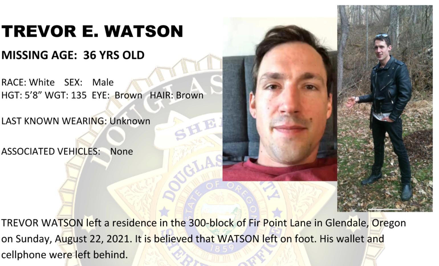 The Douglas County Sheriff's Office is asking for the public's assistance in locating a missing Ashland man. On Sunday, August 22, 2021, the Douglas County Sheriff's Office took a missing person report from the family of 36-year-old Trevor E. Watson of Ashland. Watson had left a residence in the 300-block of Fir Point Lane in Glendale on foot and hasn't been in contact with family since. He left behind his cellphone and wallet. Deputies and Search and Rescue volunteers have been unable to locate Watson and are asking anyone who may have information as to Watson's whereabouts to contact the Douglas County Sheriff's Office at (541) 440-4471. Watson is described as a white male adult standing at 5'8" tall weighing 135 pounds. He has light brown hair and light brown eyes. Case #21-3792