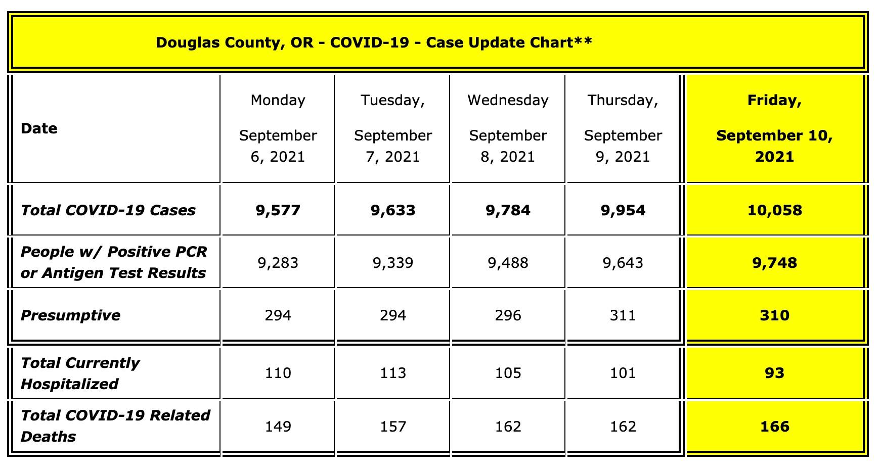 COVID-19 UPDATE FOR FRIDAY, SEPTEMBER 10, 2021: As of 12:00 pm today, Friday, September 10, 2021, there are ONE HUNDRED AND FOUR (104) people with new positive test results, ONE (1) presumptive that has been moved to a positive with a positive test result and FOUR (4) new COVID-19 related deaths to report, bringing the total number of cases of people with positive test results and presumptives in Douglas County to 10,058*. Currently, there are NINETY-THREE (93) Douglas County COVID-19 patients that are being hospitalized, sixty-two locally and thirty-one out-of-the-area, including one that has been transferred out of the state for specialized care not available here. We continue to work with Mercy to provide information on our COVID patients being hospitalized locally: 15 ventilators (invasive mechanical airway support) and 14 BiPAP’s (Non-invasive ventilation for breathing support) machines are currently in use, 14 COVID positive patients are in the Intensive Care Unit (ICU) and 15 are in the Progressive Care Unit (PCU). 54% of the total hospitalized patients at Mercy are COVID positive. Of our hospitalized cases today, NINETY-ONE (91) out of the 93 are not fully vaccinated. COVID-19 RECAP FOR THURSDAY, SEPTEMBER 9, 2021: On Thursday, September 9, 2021, at 12:00 pm we had ONE HUNDRED AND FIFTY-FIVE (155)people with new positive test results and FIFTEEN (15) new presumptives to report bringing our total number of cases of people with positive test results and presumptives in Douglas County to 9,954*. We had ONE HUNDRED AND ONE (101) Douglas County COVID-19 patients hospitalized, seventy-one locally and thirty out-of-the-area, including one patient that has been transferred out of the state for specialized care not available here. We continue to work with Mercy to provide information on our COVID patients being hospitalized locally: 19 ventilators (invasive mechanical airway support) and 11 BiPAP’s (Non-invasive ventilation for breathing support) machines are currently in use, 16 COVID positive patients are in the Intensive Care Unit (ICU) and 14 are in the Progressive Care Unit (PCU). 53% of the total hospitalized patients at Mercy are COVID positive. Of our hospitalized cases on Thursday, NINETY-EIGHT (98) out of the 101 are not fully vaccinated. COVID-19 RELATED DEATHS OF DOUGLAS COUNTY RESIDENTS Our Douglas County Public Health Officer, Dr. Robert Dannenhoffer, has confirmed the deaths of four more Douglas County residents related to the COVID-19 virus. Our one hundred and sixty-third COVID-19 related death was a 54-year-old woman who was diagnosed with COVID-19 on Monday, August 16, 2021 and passed away on Wednesday, September 8, 2021. She was not vaccinated. Our one hundred and sixty-fourth COVID-19 related death was a 57-year-old man who was diagnosed with COVID-19 on Wednesday, August 18, 2021 and passed away on Wednesday, September 8, 2021. He was not vaccinated. Our one hundred and sixty-fifth COVID-19 related death was a 68-year-old woman who was diagnosed with COVID-19 on Saturday, August 28, 2021 and passed away on Wednesday, September 8, 2021. She was not vaccinated. Our one hundred and sixty-sixth COVID-19 related death was a 24-year-old woman who was diagnosed with COVID-19 on Thursday, August 26, 2021 and passed away on Thursday, September 9, 2021. She was not vaccinated. In the interest of privacy for the loved ones of these residents and as our ethical responsibility to follow all medical laws, no additional information will be released. We thoroughly scrutinize and investigate all deaths, and review all medical records to make sure that everyone we list has met the requirements for a COVID related death, as per the Oregon Investigative Guidelines. Each death related to COVID-19 is painful for all Douglas County residents, and a sad reminder of the terrible impact COVID-19 has had in our local communities. The Douglas County Board of Commissioners, Dr. Dannenhoffer, DPHN and the DCCRT team extend our heartfelt condolences and sympathies to all family members, friends, relatives, co-workers and community members of those who have passed after contracting this deadly virus.