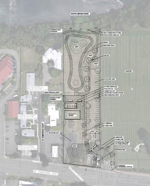 The last undeveloped riverfront property in Roseburg is being turned into an outdoor recreation center with miniature golf, a velodrome BMX bike racing track, bouldering walls, a splash pad, ping pong, foosball, cornhole and other activities as well as a central clubhouse where community members can take lifestyle and nutrition classes in a teaching kitchen. The park will be called Thundering Water, which the park board president Cordell Smith said is the Chinook translation of “Umpqua.” The opening is set for Memorial Day weekend of 2023. Cordell said the center is an extension of healthcare in Roseburg by being a preventative, proactive approach to providing affordable recreation and lifestyle and nutrition education. By getting more of the community moving together and connecting with each other, Smith and the other board members believe they can help bring the rates of preventable diseases down, like high blood pressure and diabetes. “The whole thing was inspired by health and wellness professionals in the county wanting to use their skills and resources to move health and wellness upstream,” Smith said. “Everything at this park is designed to strengthen parent and children relationships as well as friends. It’s a small way that we can move our efforts upstream to prevent illness. People in healthcare spend so much time on the back end dealing with the aftermath.” Smith is a foot and ankle doctor in Roseburg who has seen firsthand how the community is suffering and the healthcare system is designed to treat symptoms and the effects of diseases instead of the causes. Douglas County is ranked among the nine least healthy counties in Oregon according to countyhealthyrankings.org. The ranking is based on length of life, premature deaths and quality of life. A lot of these health rankings have environmental and personal choice factors, but those personal choices and the diseases themselves impact the community from the burden on the local healthcare, to the food options available by popular demand, to how long a child has a parent, or how long a child will live. “There really is no such thing as a private choice,” Smith said. “Every private choice we make has public consequences.” The park is a nonprofit built for the community, by the community. The board is made up of community members in engineering, healthcare, education, and manufacturing. The project already has a long list of people in the community who have committed time and money to making the project work from city councilors to local contractors and food truck operators to nutrition educators. “There’s a lot of people stepping forward to make this happen,” Smith said. Smith said the park will be family friendly and fun “whether you’re 90 years old or 5 years old.” The property at 1802 W Harvard Ave. is approximately 3.5 acres and the project budget is $2.5 million. The park will be open to receive small and large donations from the community by cash and check to Smith’s clinic at 2300 NW Stewart Pkwy, care of Cordell Smith. Checks can be addressed to Thundering Water. Donors will be given a tax-deduction slip.
